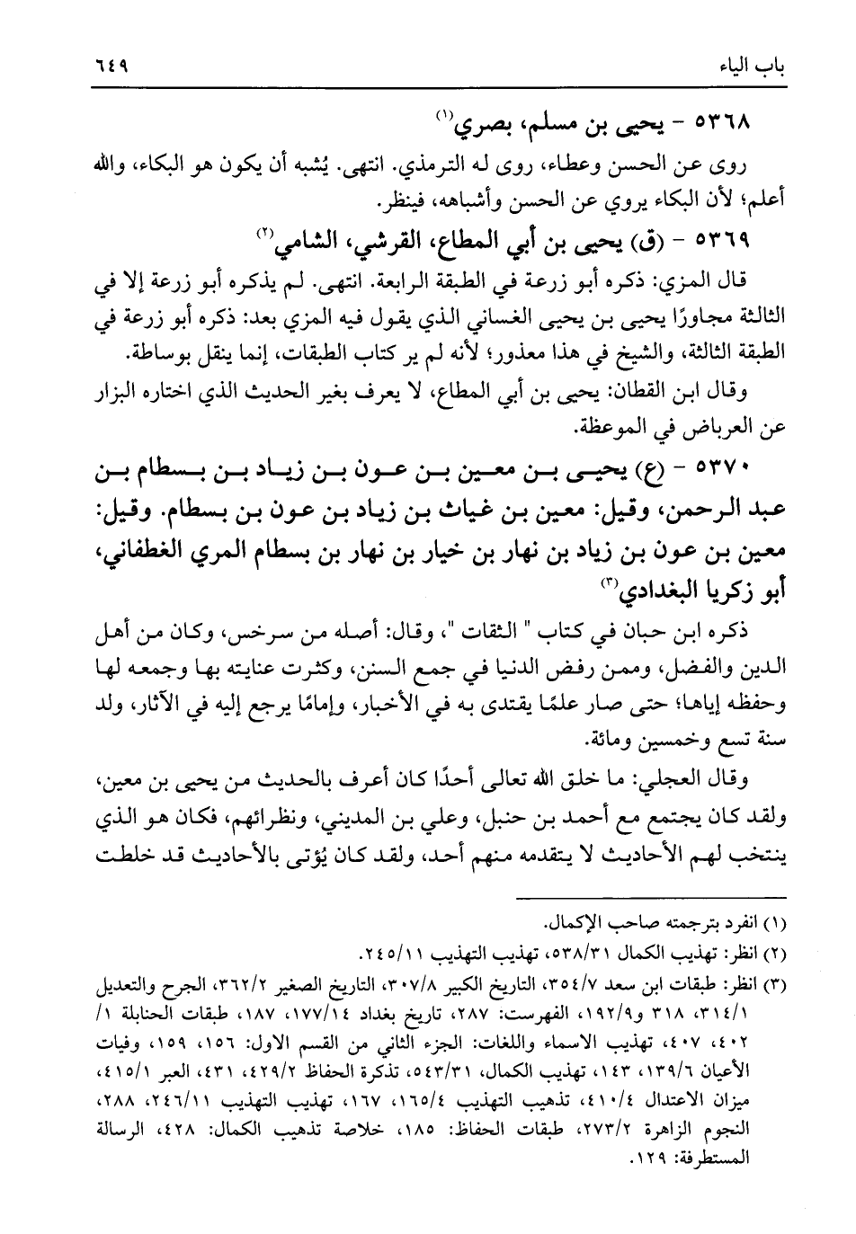 ٥٣٧٠ - (ع) يحيى بن معين بن عون بن زياد بن بسطام بن عبد الرحمن، وقيل: معين بن غياث بن زياد بن عون بن بسطام. وقيل: معين بن عون بن زياد بن نهار بن خيار بن نهار بن بسطام المري الغطفاني، أبو زكريا البغدادي (¬٣)