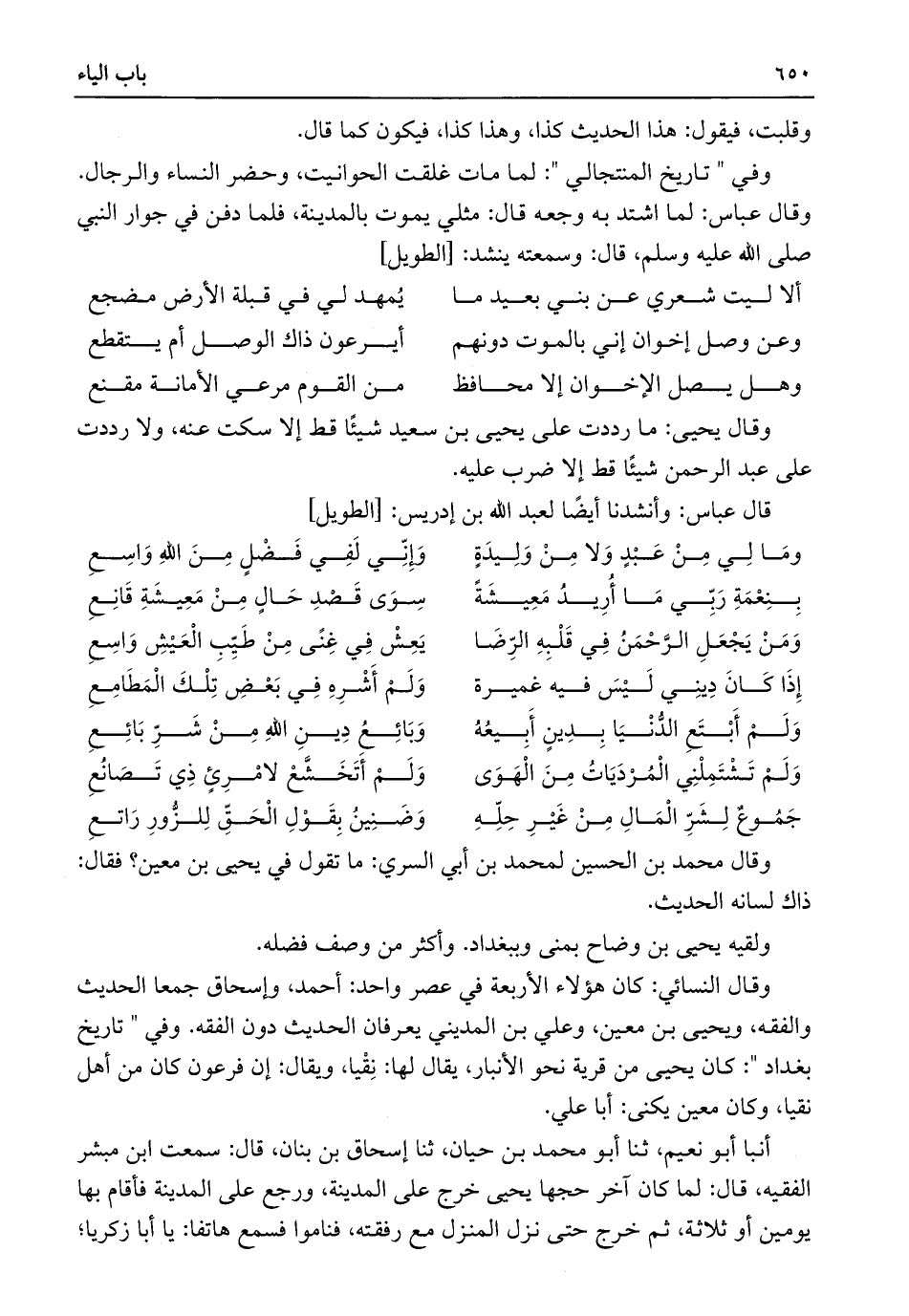 وقال محمد بن الحسين لمحمد بن أبي السري: ما تقول في يحيى بن معين؟ فقال: ذاك لسانه الحديث.