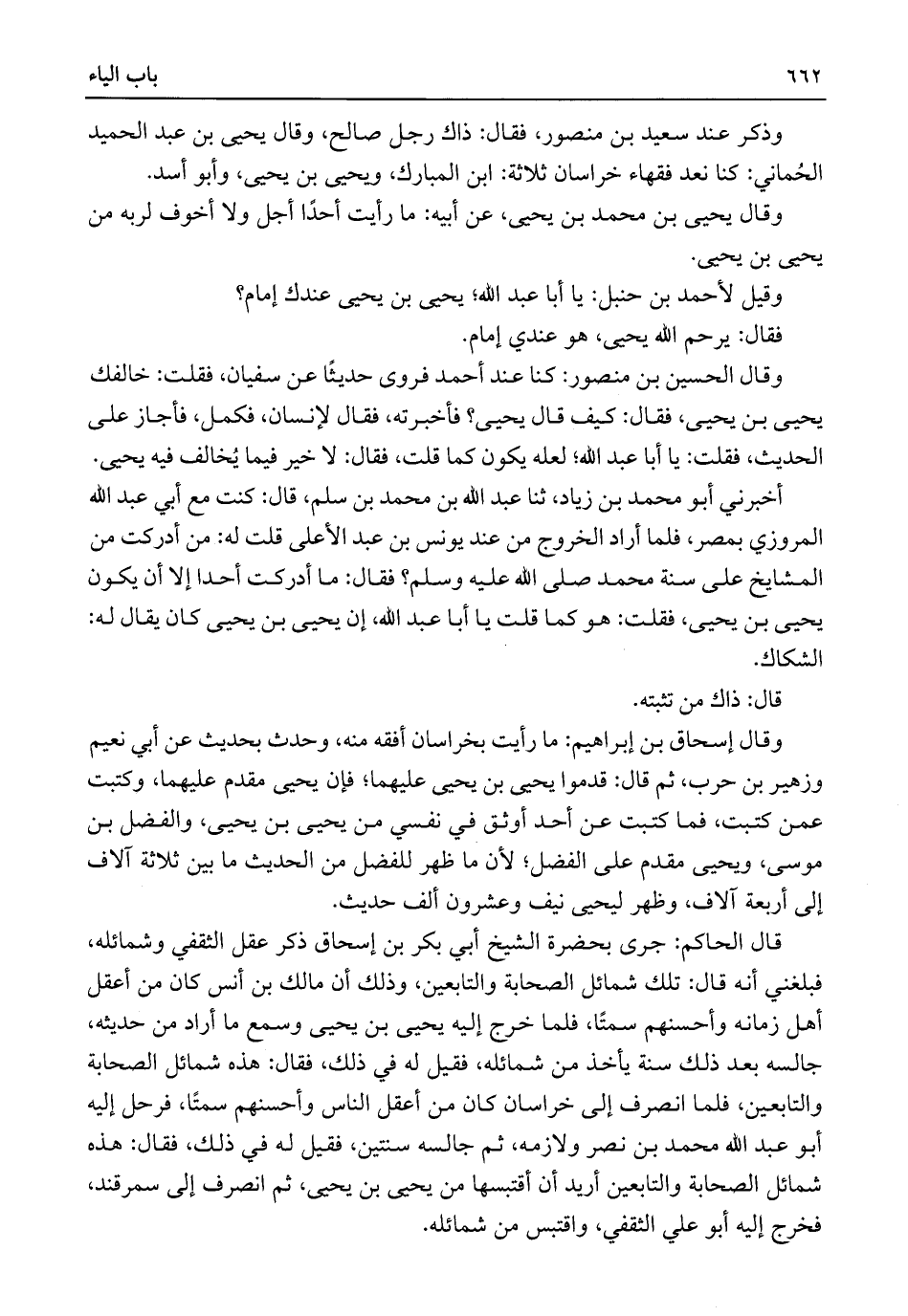 وقال إسحاق بن إبراهيم: ما رأيت بخراسان أفقه منه، وحدث بحديث عن أبي نعيم وزهير بن حرب، ثم قال: قدموا يحيى بن يحيى عليهما؛ فإن يحيى مقدم عليهما، وكتبت عمن كتبت، فما كتبت عن أحد أوثق في نفسي من يحيى بن يحيى، والفضل بن موسى، ويحيى مقدم على الفضل؛ لأن ما ظهر للفضل من الحديث ما بين ثلاثة آلاف إلى أربعة آلاف، وظهر ليحيى نيف وعشرون ألف حديث.