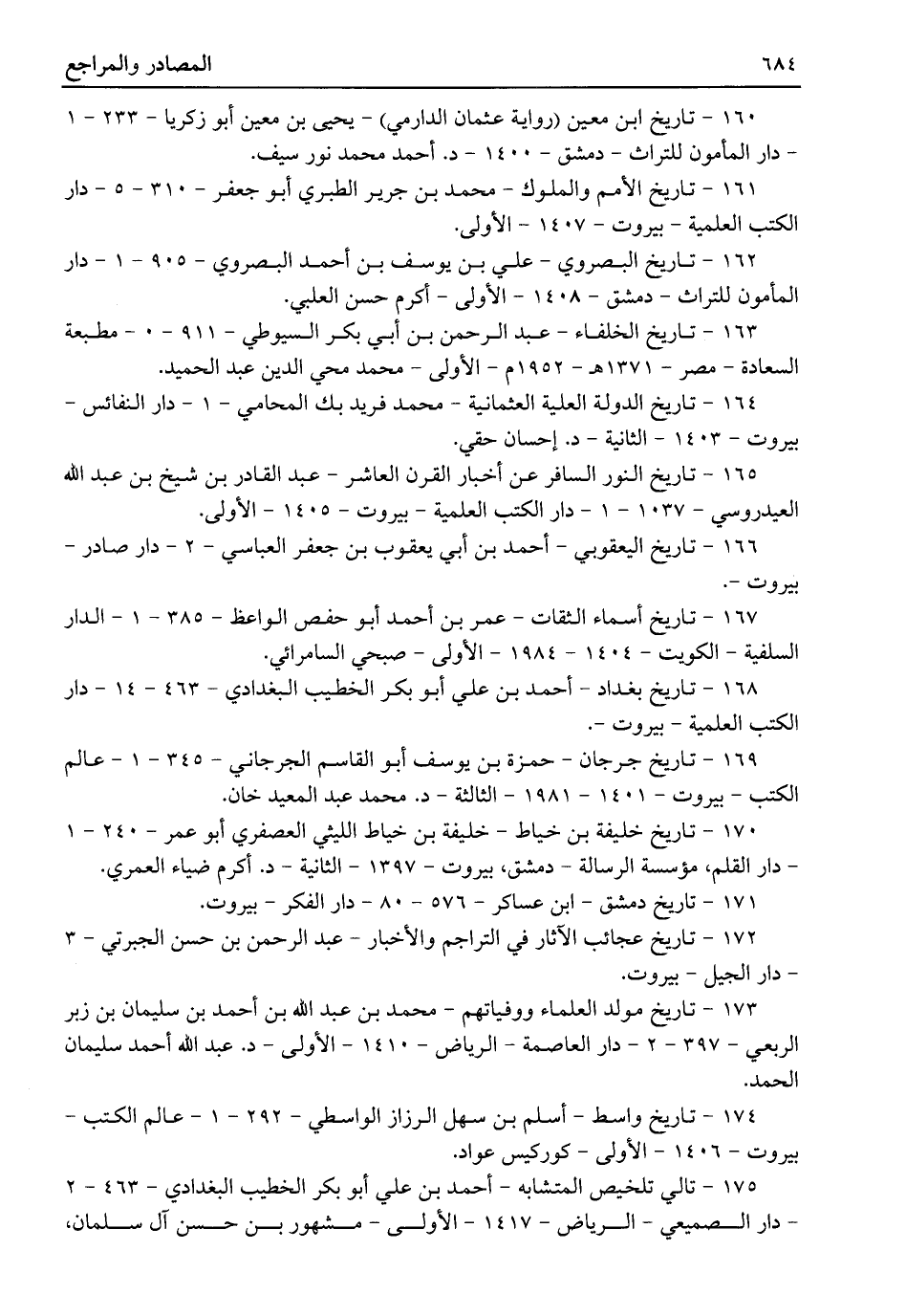 ١٦٣ - تاريخ الخلفاء - عبد الرحمن بن أبي بكر السيوطي - ٩١١ - ١ - مطبعة السعادة - مصر - ١٣٧١ هـ - ١٩٥٢ م - الأولى - محمد محي الدين عبد الحميد.
