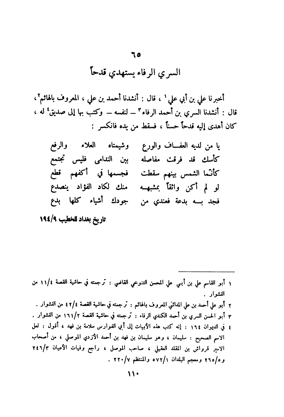 أخبرنا علي بن أبي علي «1» ، قال: أنشدنا أحمد بن علي، المعروف بالهائم «2» ، قال: أنشدنا السري بن أحمد الرفاء «3» - لنفسه- وكتب بها إلى صديق «4» له، كان أهدى إليه قدحا حسنا، فسقط من يده فانكسر: