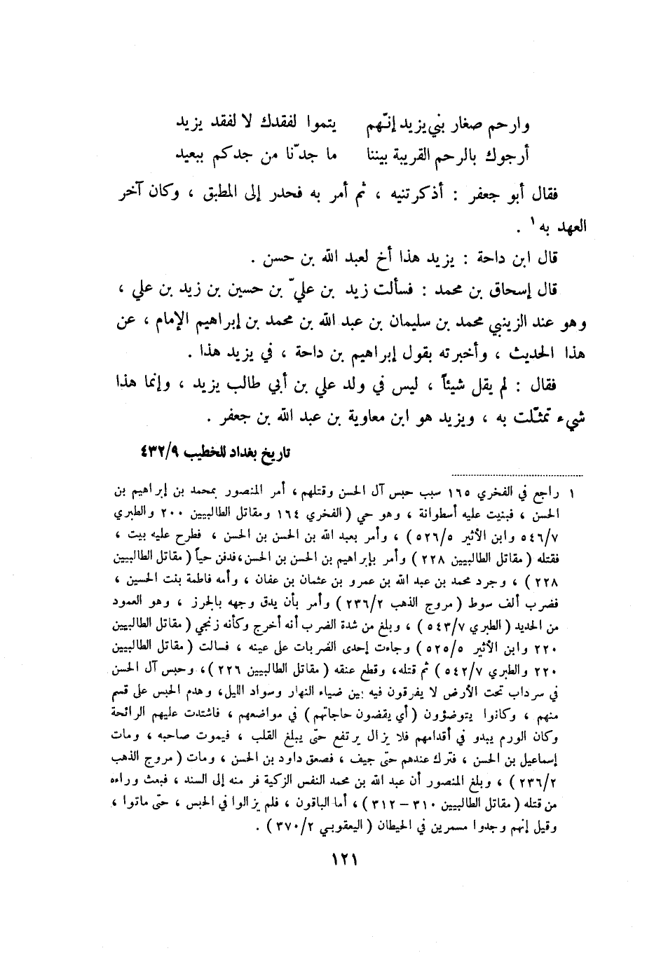 فقال: لم يقل شيئا، ليس في ولد علي بن أبي طالب يزيد، وإنما هذا شيء تمثّلت به، ويزيد هو ابن معاوية بن عبد الله بن جعفر.