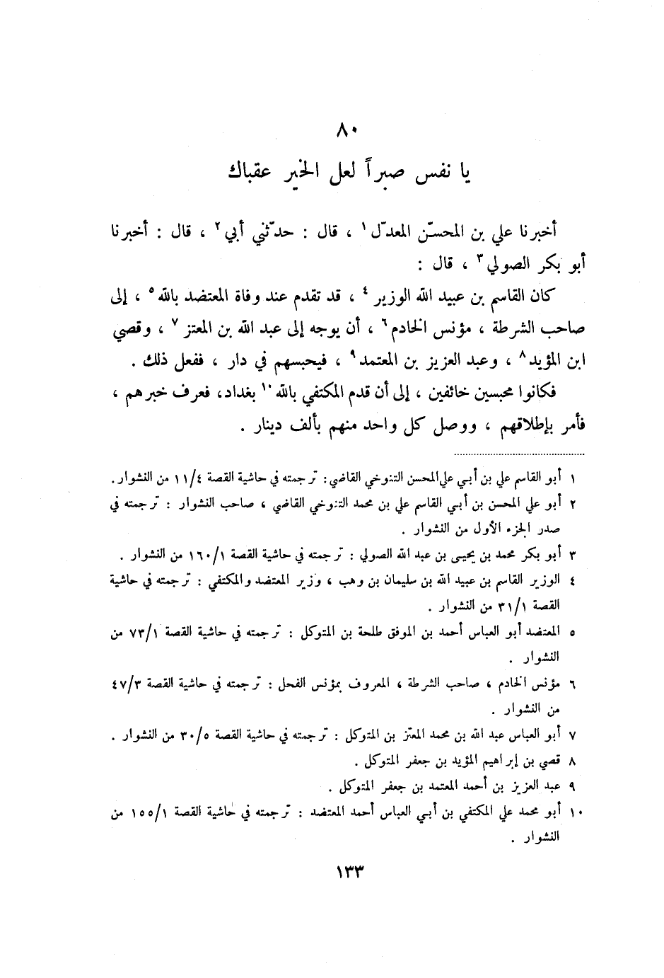 أخبرنا علي بن المحسّن المعدّل «1» ، قال: حدّثني أبي «2» ، قال: أخبرنا أبو بكر الصولي «3» ، قال:
