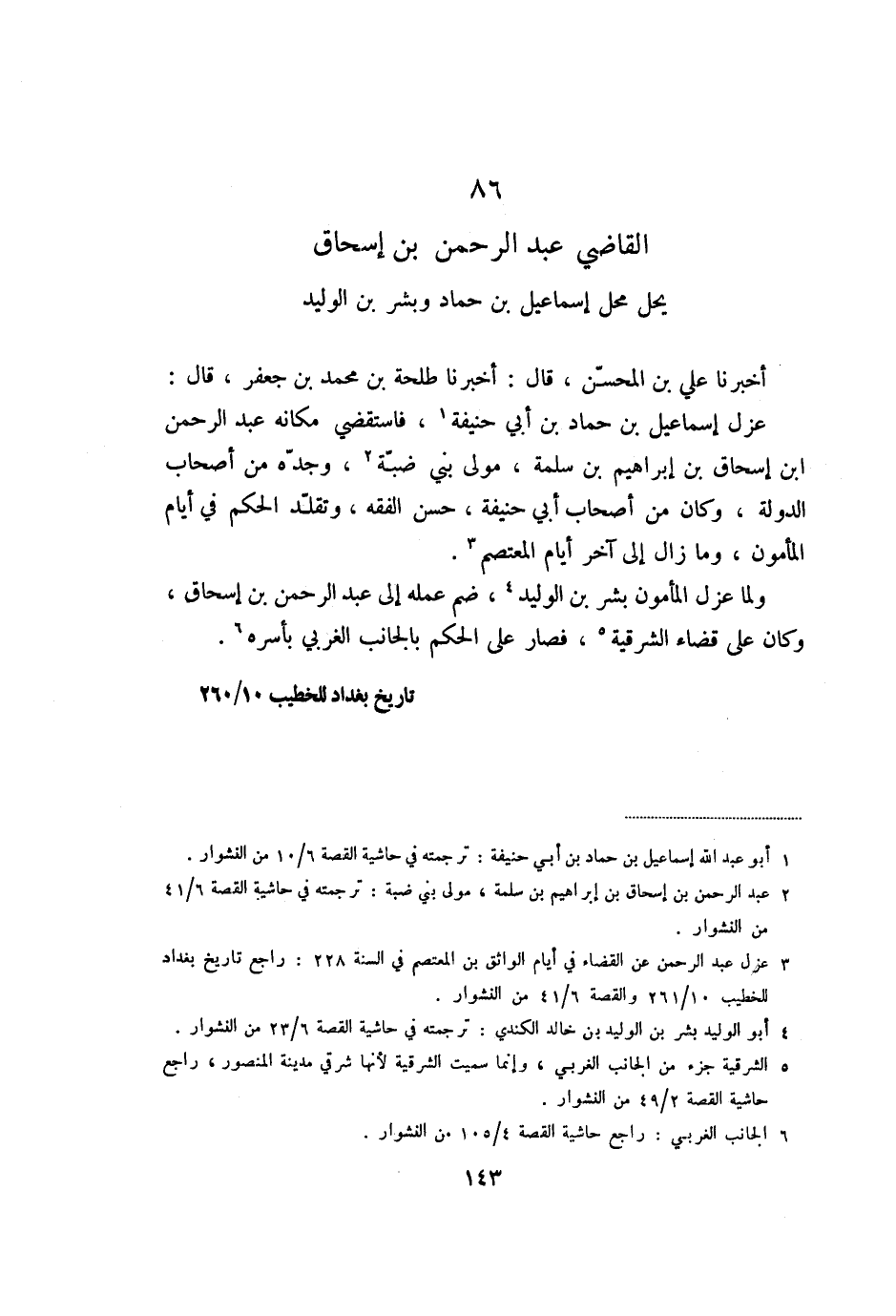 86 القاضي عبد الرحمن بن إسحاق يحل محل إسماعيل بن حماد وبشر بن الوليد