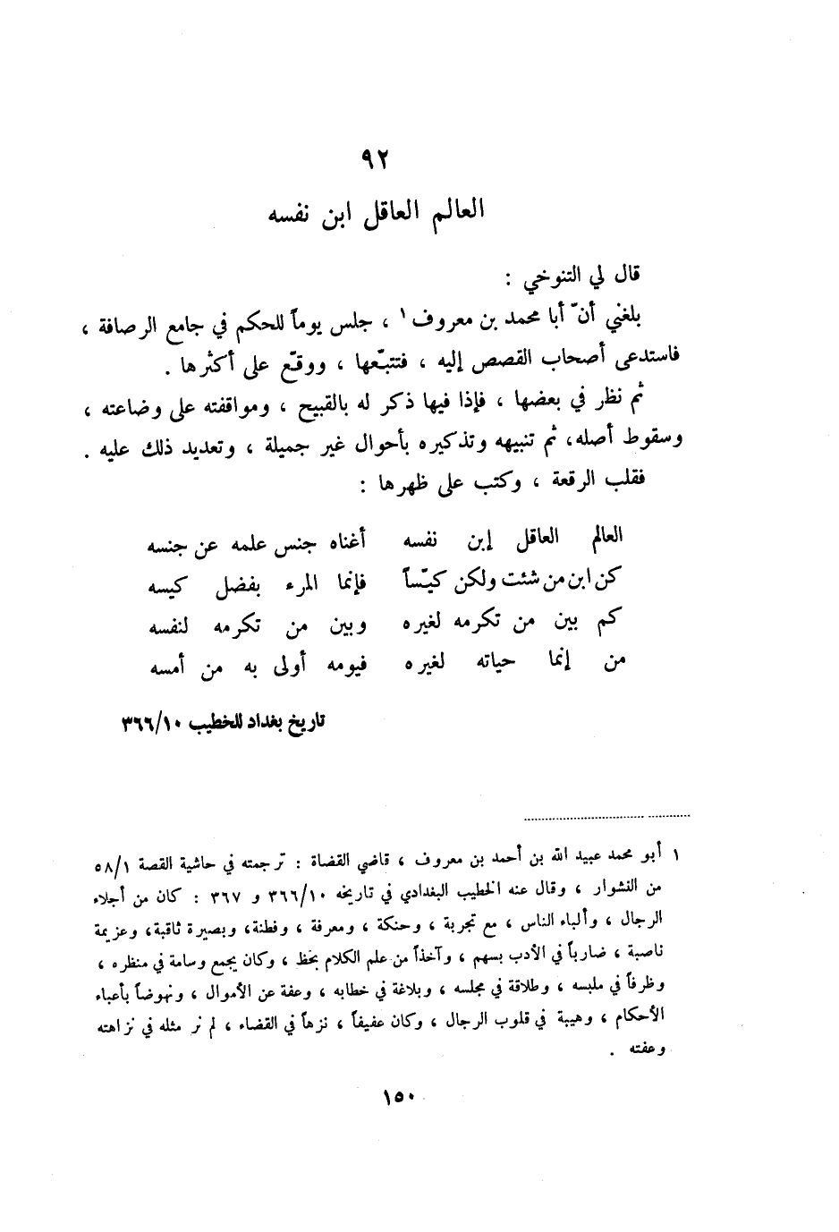 بلغني أنّ أبا محمد بن معروف «1» ، جلس يوما للحكم في جامع الرصافة، فاستدعى أصحاب القصص إليه، فتتبّعها، ووقّع على أكثرها.