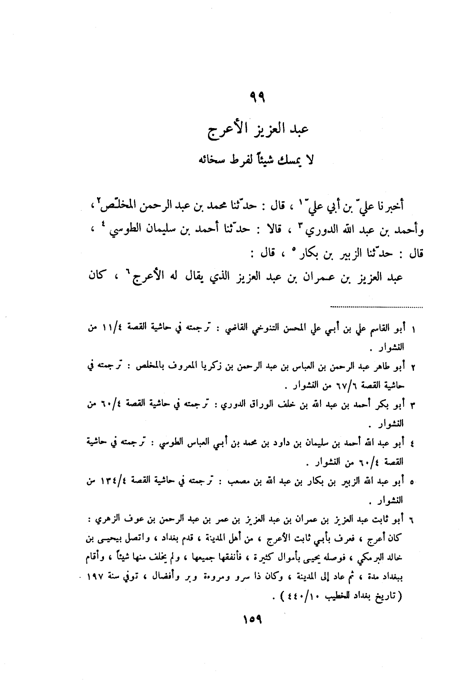 أخبرنا عليّ بن أبي عليّ «1» ، قال: حدّثنا محمد بن عبد الرحمن المخلّص «2» ، وأحمد بن عبد الله الدوري «3» ، قالا: حدّثنا أحمد بن سليمان الطوسي «4» ، قال: حدّثنا الزبير بن بكار «5» ، قال: