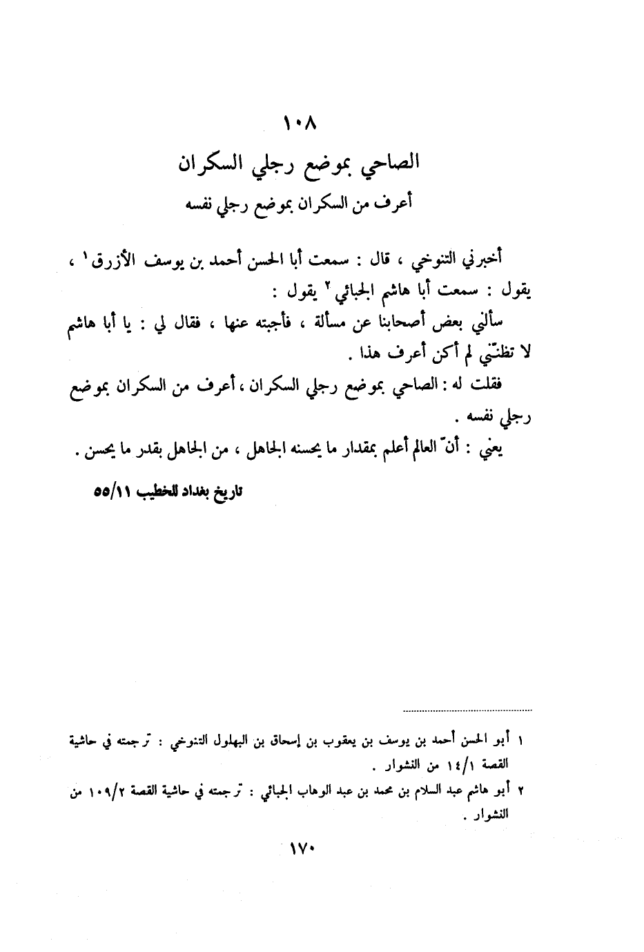 أخبرني التنوخي، قال: سمعت أبا الحسن أحمد بن يوسف الأزرق «1» ، يقول: سمعت أبا هاشم الجبائي «2» يقول: