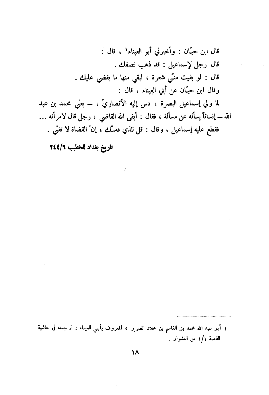 لما ولي إسماعيل البصرة، دس إليه الأنصاريّ،- يعني محمد بن عبد الله- إنسانا يسأله عن مسألة، فقال: أبقى الله القاضي، رجل قال لامرأته ...