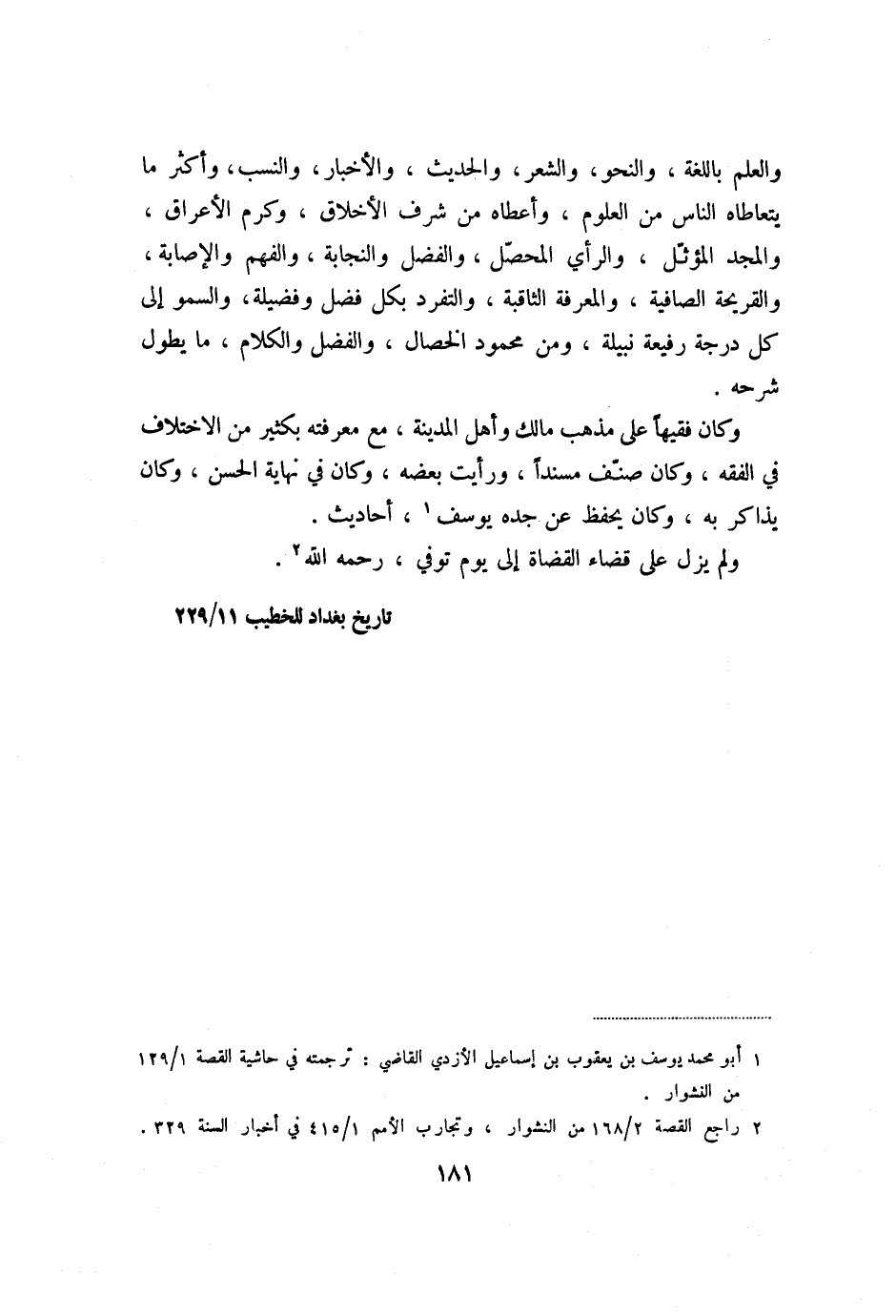 وكان فقيها على مذهب مالك وأهل المدينة، مع معرفته بكثير من الاختلاف في الفقه، وكان صنّف مسندا، ورأيت بعضه، وكان في نهاية الحسن، وكان يذاكر به، وكان يحفظ عن جده يوسف «1» ، أحاديث.
