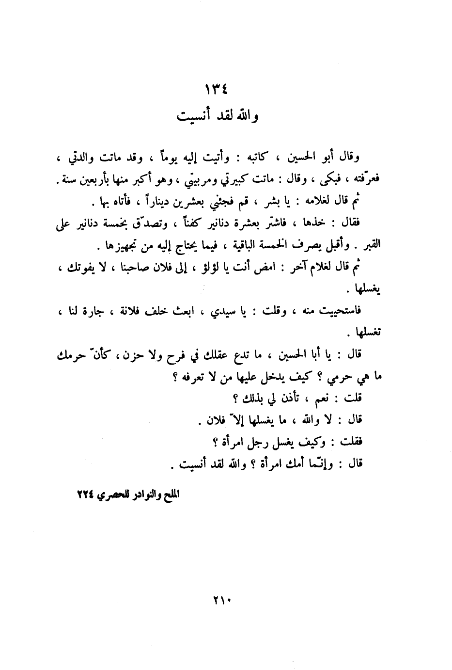 ثم قال لغلام آخر: امض أنت يا لؤلؤ، إلى فلان صاحبنا، لا يفوتك، يغسلها.