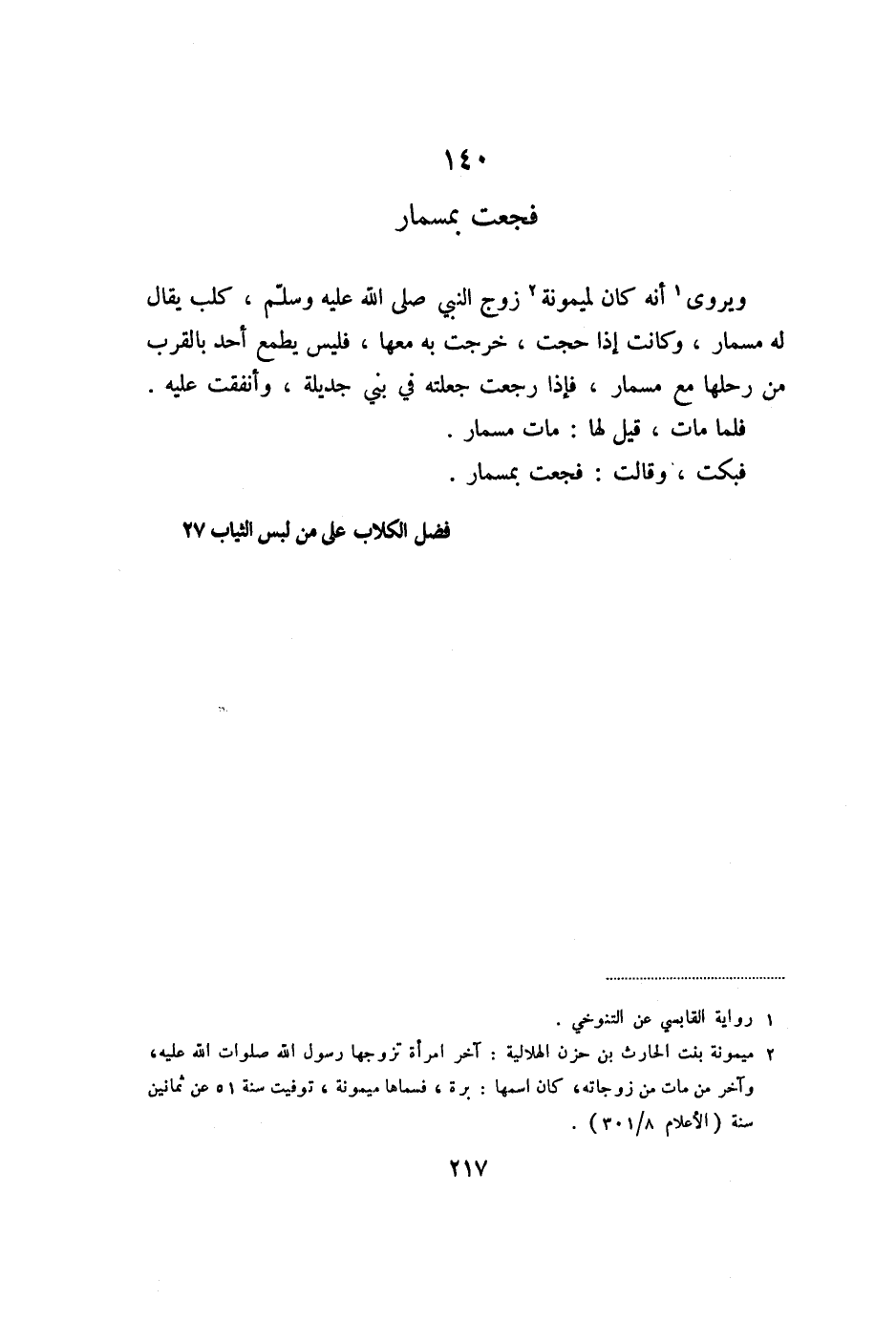ويروى «1» أنه كان لميمونة «2» زوج النبي صلى الله عليه وسلّم، كلب يقال له مسمار، وكانت إذا حجت، خرجت به معها، فليس يطمع أحد بالقرب من رحلها مع مسمار، فإذا رجعت جعلته في بني جديلة، وأنفقت عليه.