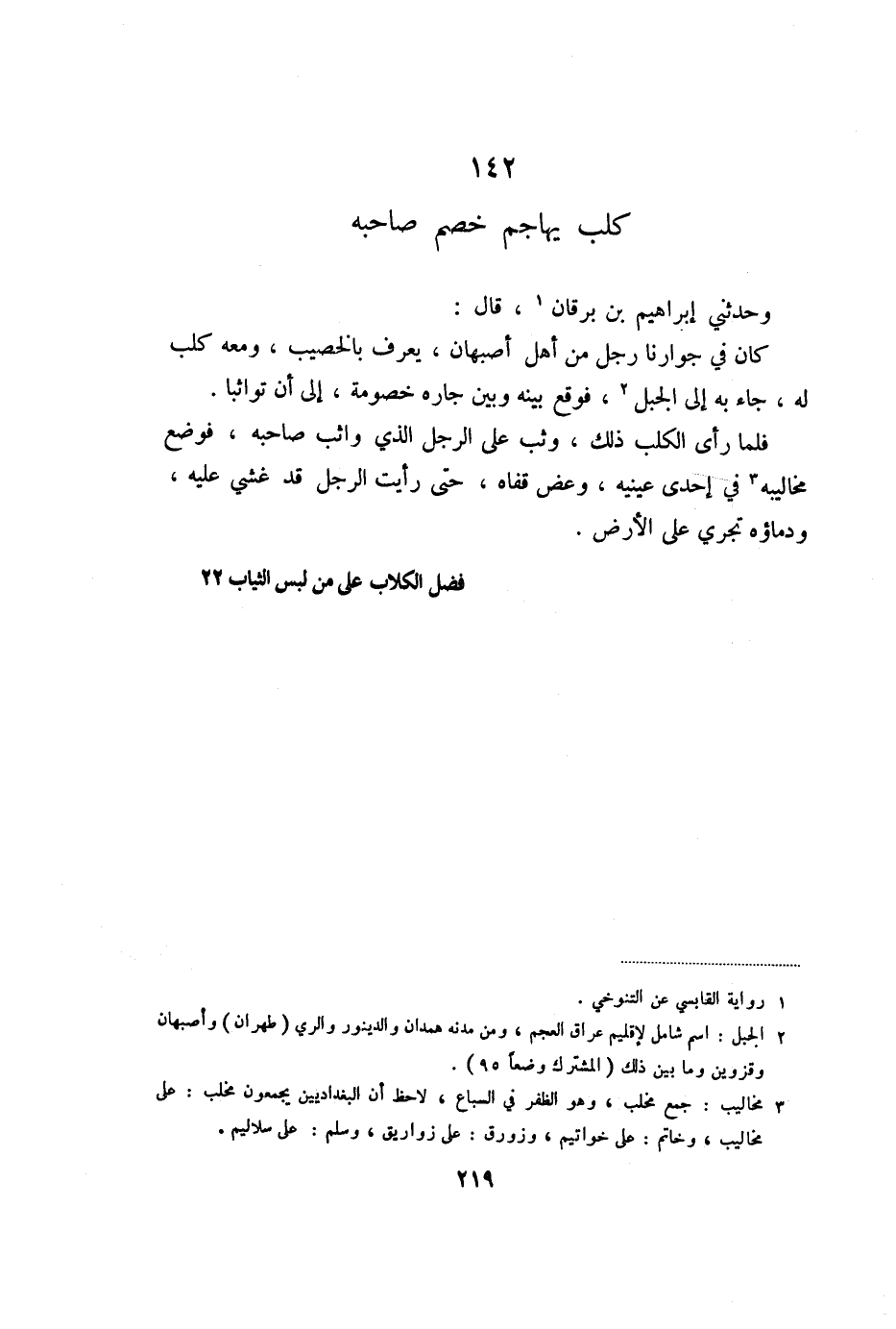 فلما رأى الكلب ذلك، وثب على الرجل الذي واثب صاحبه، فوضع مخاليبه «3» في إحدى عينيه، وعض قفاه، حتى رأيت الرجل قد غشي عليه، ودماؤه تجري على الأرض.