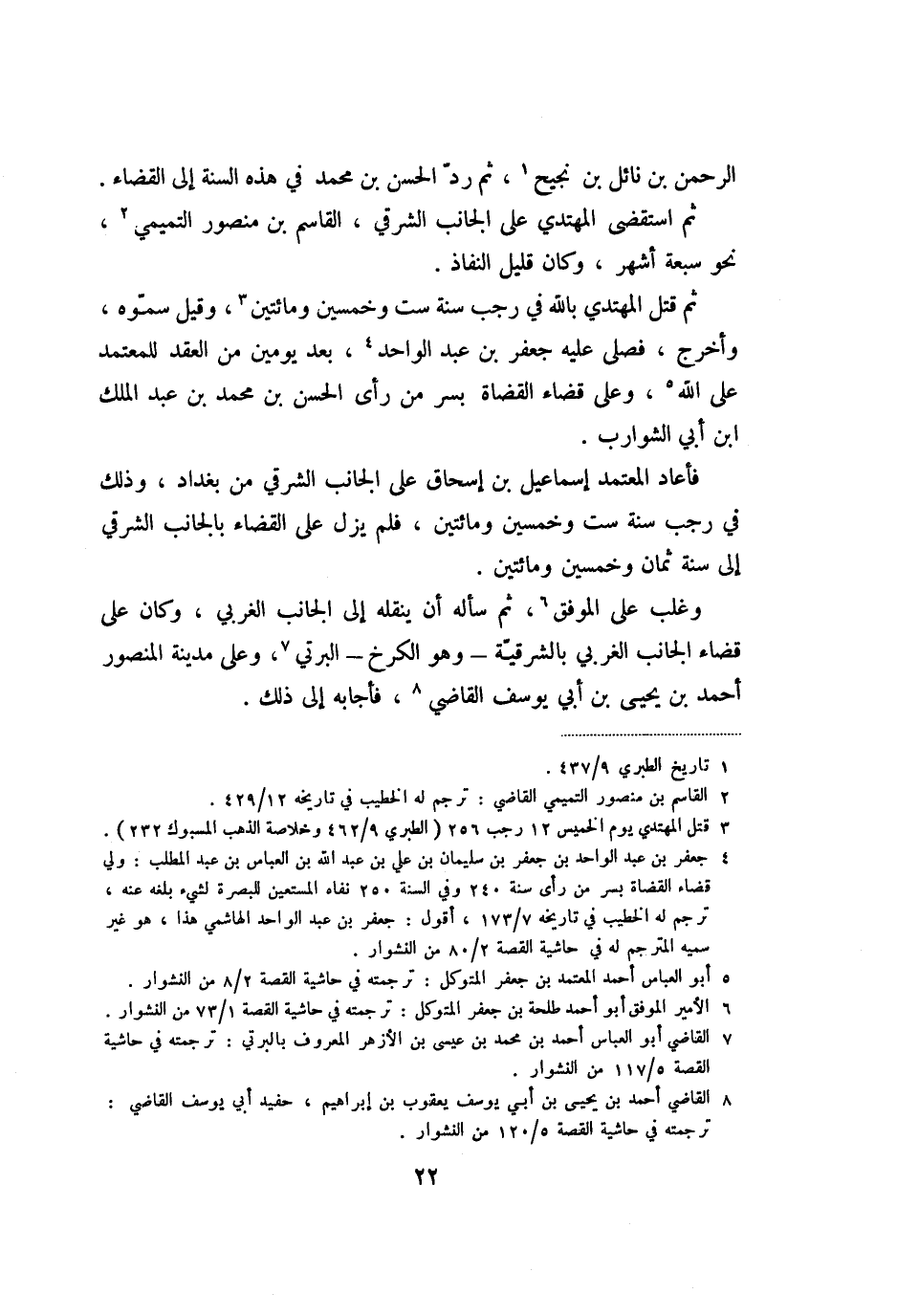 ثم قتل المهتدي بالله في رجب سنة ست وخمسين ومائتين «3» ، وقيل سمّوه، وأخرج، فصلى عليه جعفر بن عبد الواحد «4» ، بعد يومين من العقد للمعتمد على الله «5» ، وعلى قضاء القضاة بسر من رأى الحسن بن محمد بن عبد الملك ابن أبي الشوارب.