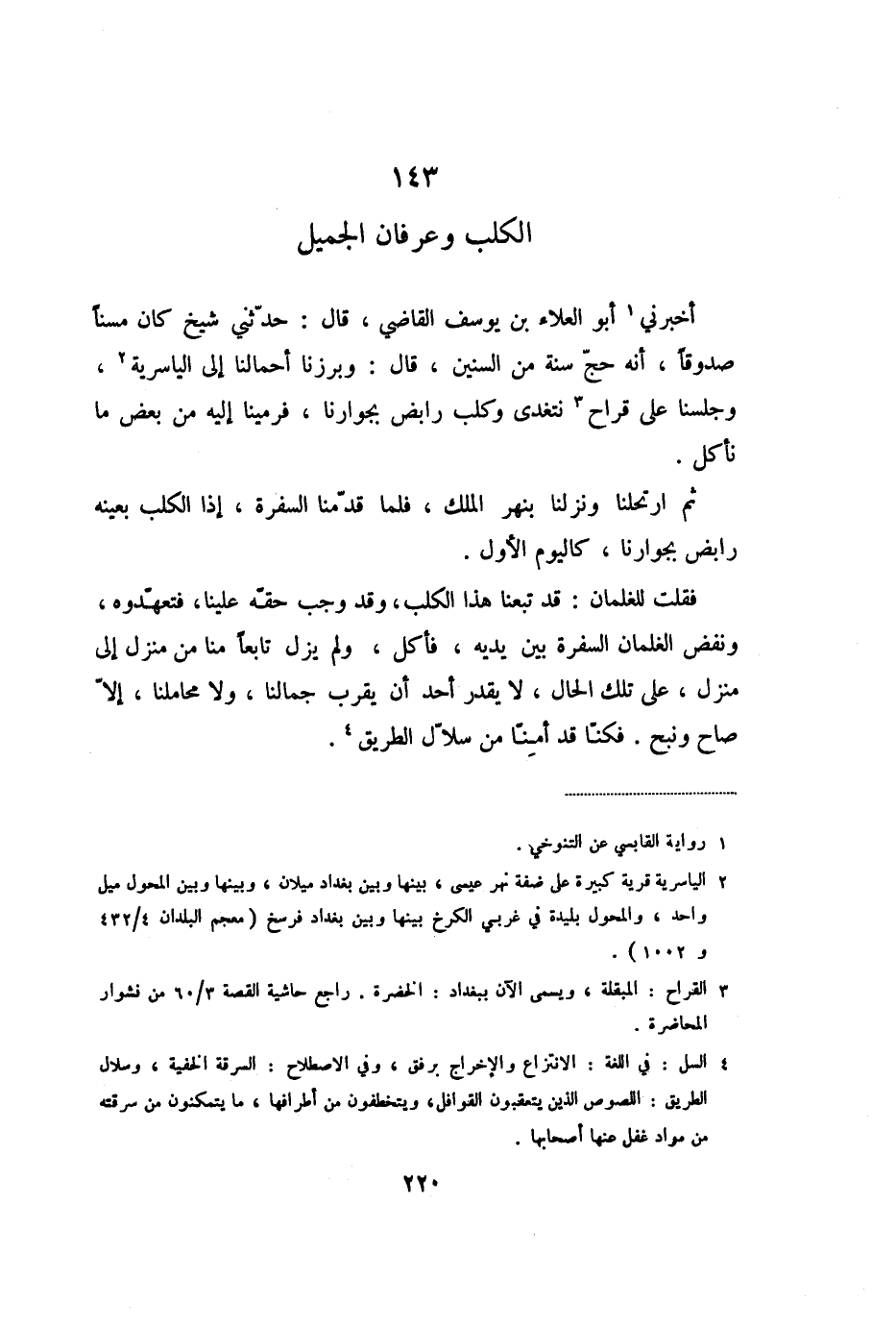 فقلت للغلمان: قد تبعنا هذا الكلب، وقد وجب حقّه علينا، فتعهّدوه، ونفض الغلمان السفرة بين يديه، فأكل، ولم يزل تابعا منا من منزل إلى منزل، على تلك الحال، لا يقدر أحد أن يقرب جمالنا، ولا محاملنا، إلّا صاح ونبح. فكنّا قد أمنّا من سلّال الطريق «4» .