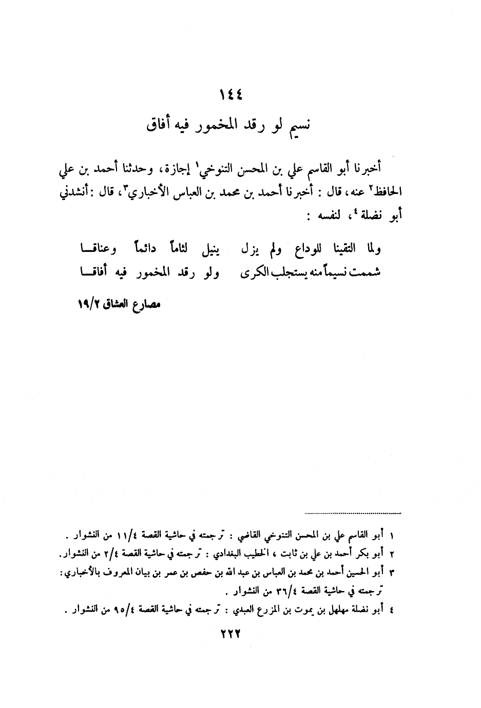 أخبرنا أبو القاسم علي بن المحسن التنوخي «1» إجازة، وحدثنا أحمد بن علي الحافظ «2» عنه، قال: أخبرنا أحمد بن محمد بن العباس الأخباري «3» ، قال: أنشدني أبو نضلة «4» ، لنفسه: