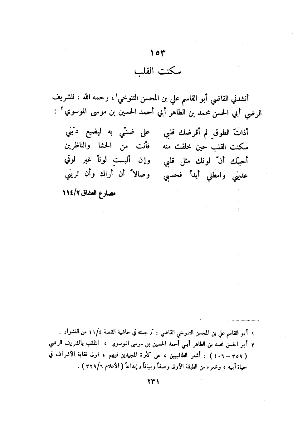 أنشدني القاضي أبو القاسم علي بن المحسن التنوخي «1» ، رحمه الله، للشريف الرضي أبي الحسن محمد بن الطاهر أبي أحمد الحسين بن موسى الموسوي «2» :