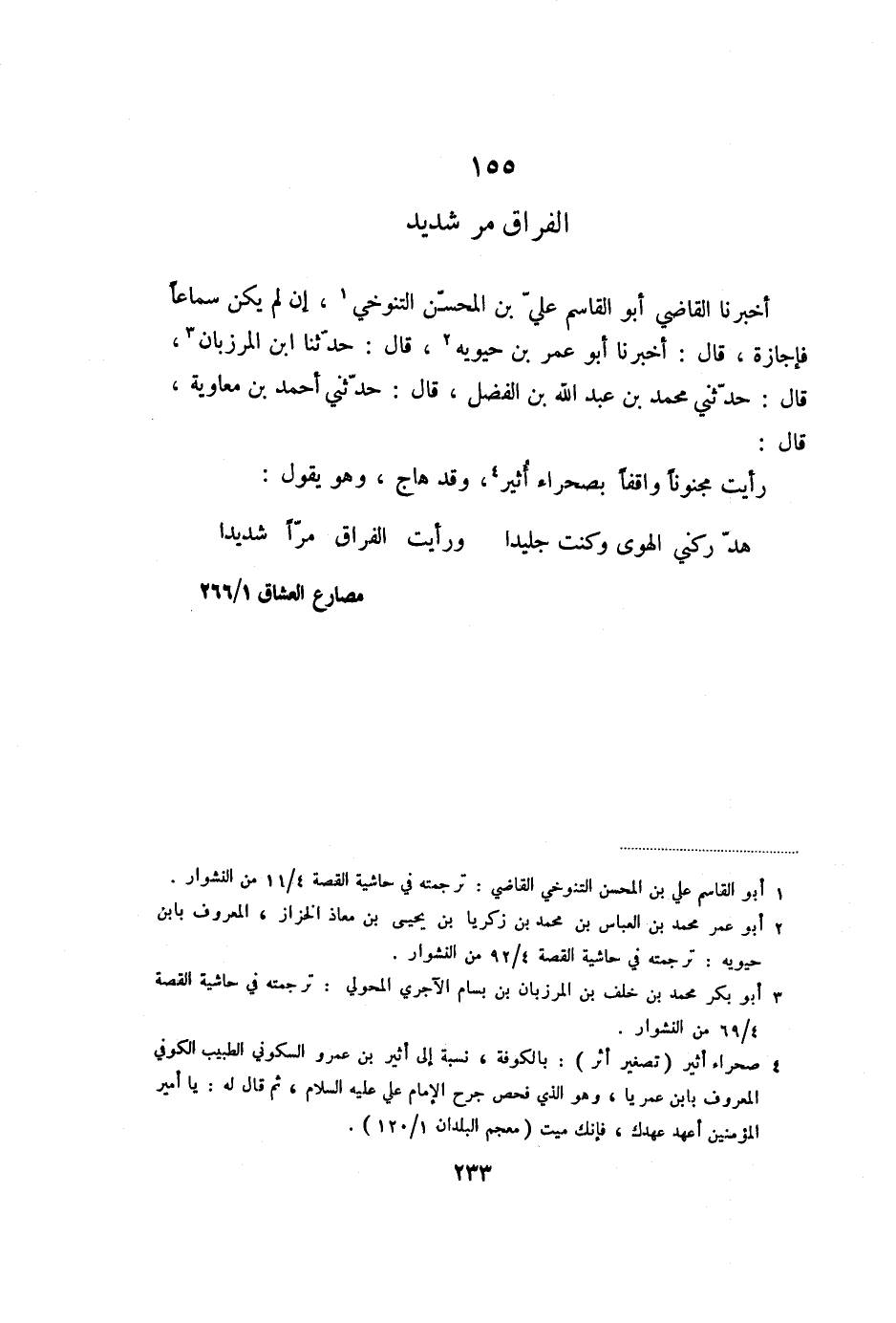 أخبرنا القاضي أبو القاسم عليّ بن المحسّن التنوخي «1» ، إن لم يكن سماعا فإجازة، قال: أخبرنا أبو عمر بن حيويه «2» ، قال: حدّثنا ابن المرزبان «3» ، قال: حدّثني محمد بن عبد الله بن الفضل، قال: حدّثني أحمد بن معاوية، قال: