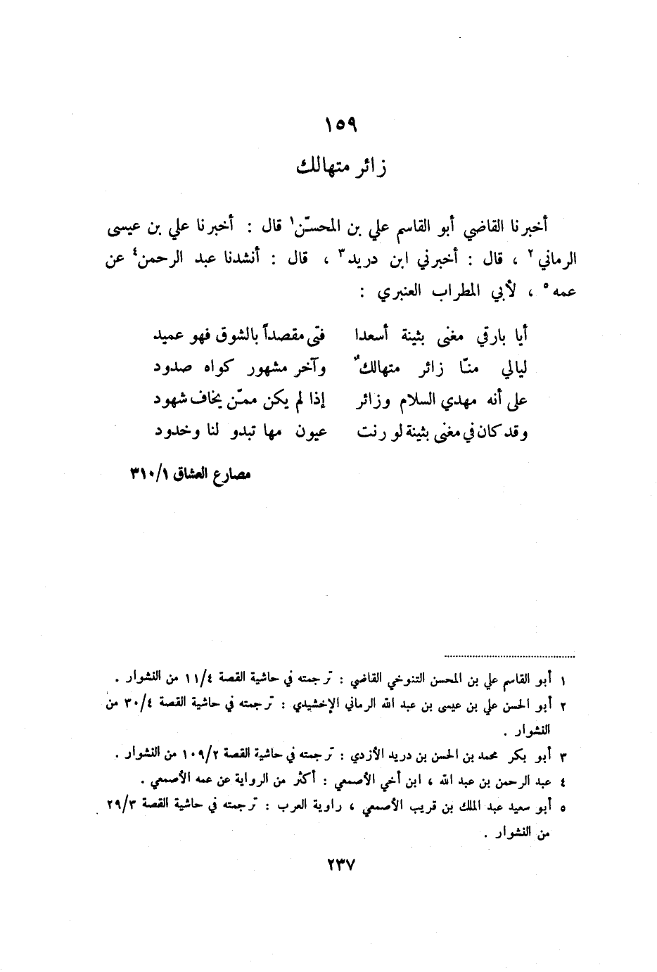 أخبرنا القاضي أبو القاسم علي بن المحسّن «1» قال: أخبرنا علي بن عيسى الرماني «2» ، قال: أخبرني ابن دريد «3» ، قال: أنشدنا عبد الرحمن «4» عن عمه «5» ، لأبي المطراب العنبري: