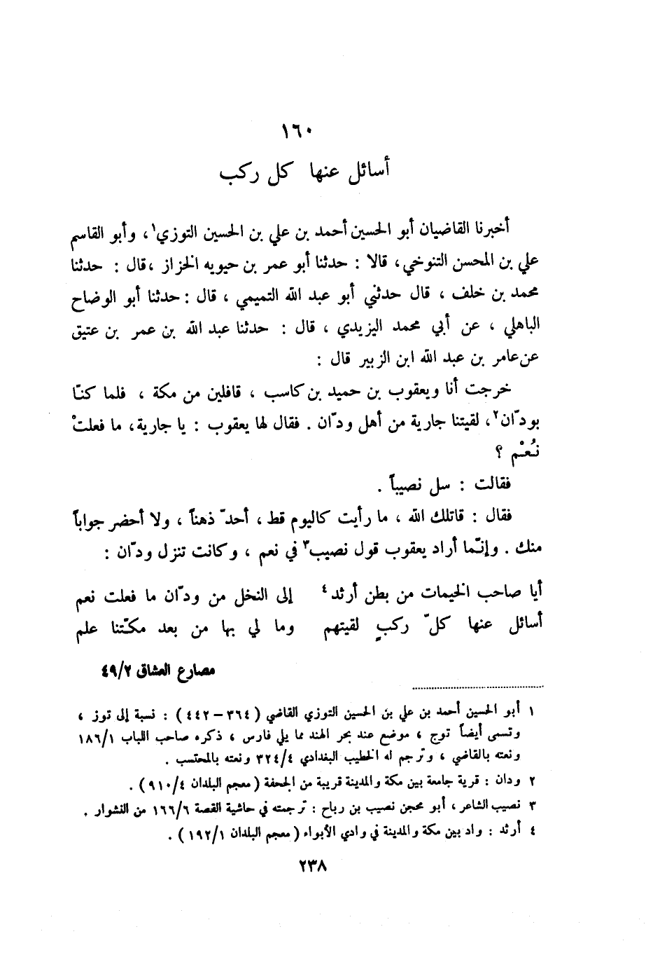 أخبرنا القاضيان أبو الحسين أحمد بن علي بن الحسين التوزي «1» ، وأبو القاسم علي بن المحسن التنوخي، قالا: حدثنا أبو عمر بن حيويه الخزاز، قال: حدثنا محمد بن خلف، قال حدثني أبو عبد الله التميمي، قال: حدثنا أبو الوضاح الباهلي، عن أبي محمد اليزيدي، قال: حدثنا عبد الله بن عمر بن عتيق عن عامر بن عبد الله ابن الزبير قال:
