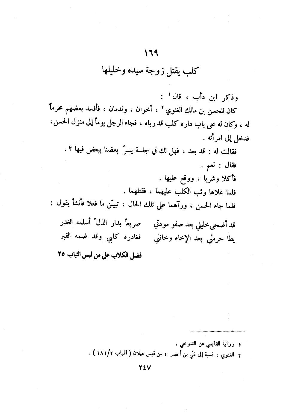 كان للحسن بن مالك الغنوي «2» ، أخوان، وندمان، فأفسد بعضهم محرما له، وكان له على باب داره كلب قد رباه، فجاء الرجل يوما إلى منزل الحسن، فدخل إلى امرأته.
