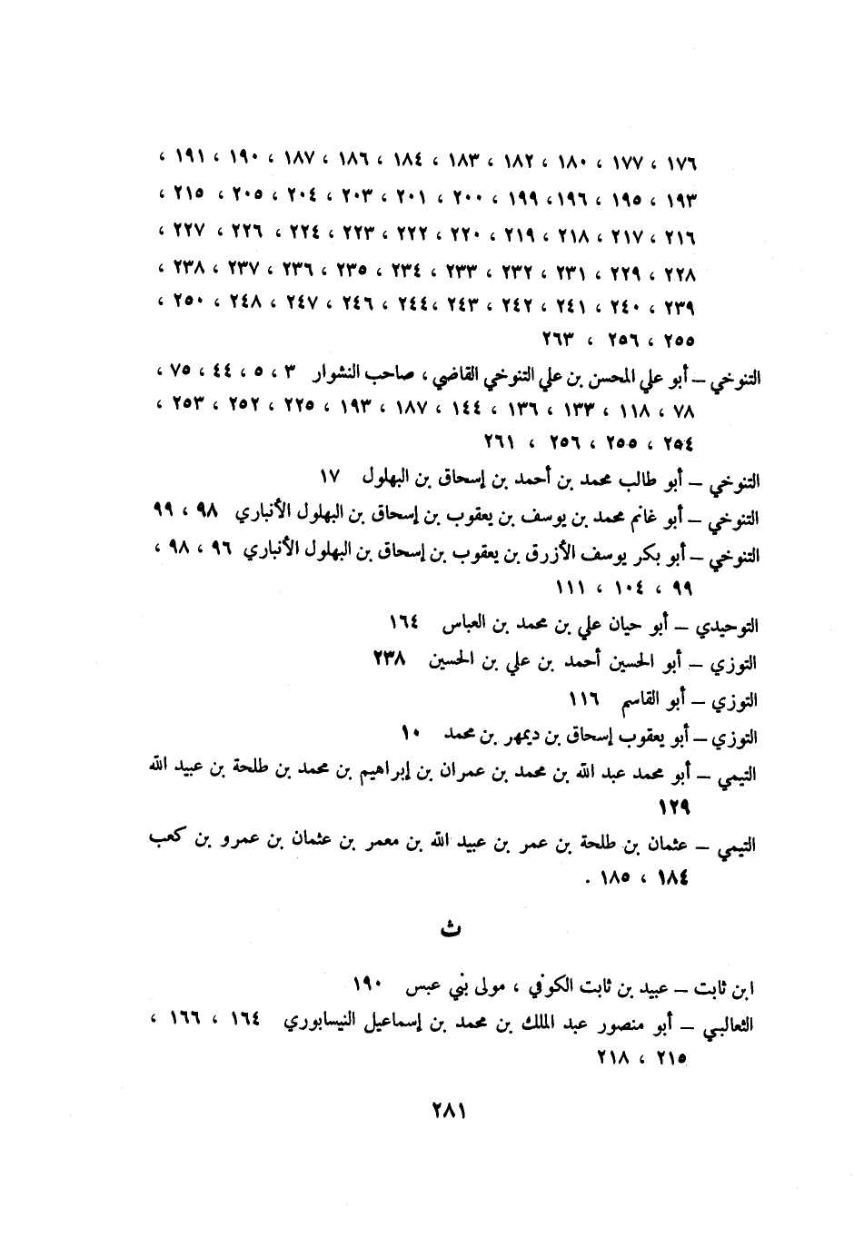 التنوخي- أبو علي المحسن بن علي التنوخي القاضي، صاحب النشوار 3، 5، 44، 75، 78، 118، 133، 136، 144، 187، 193، 225، 252، 253، 254، 255، 256، 261