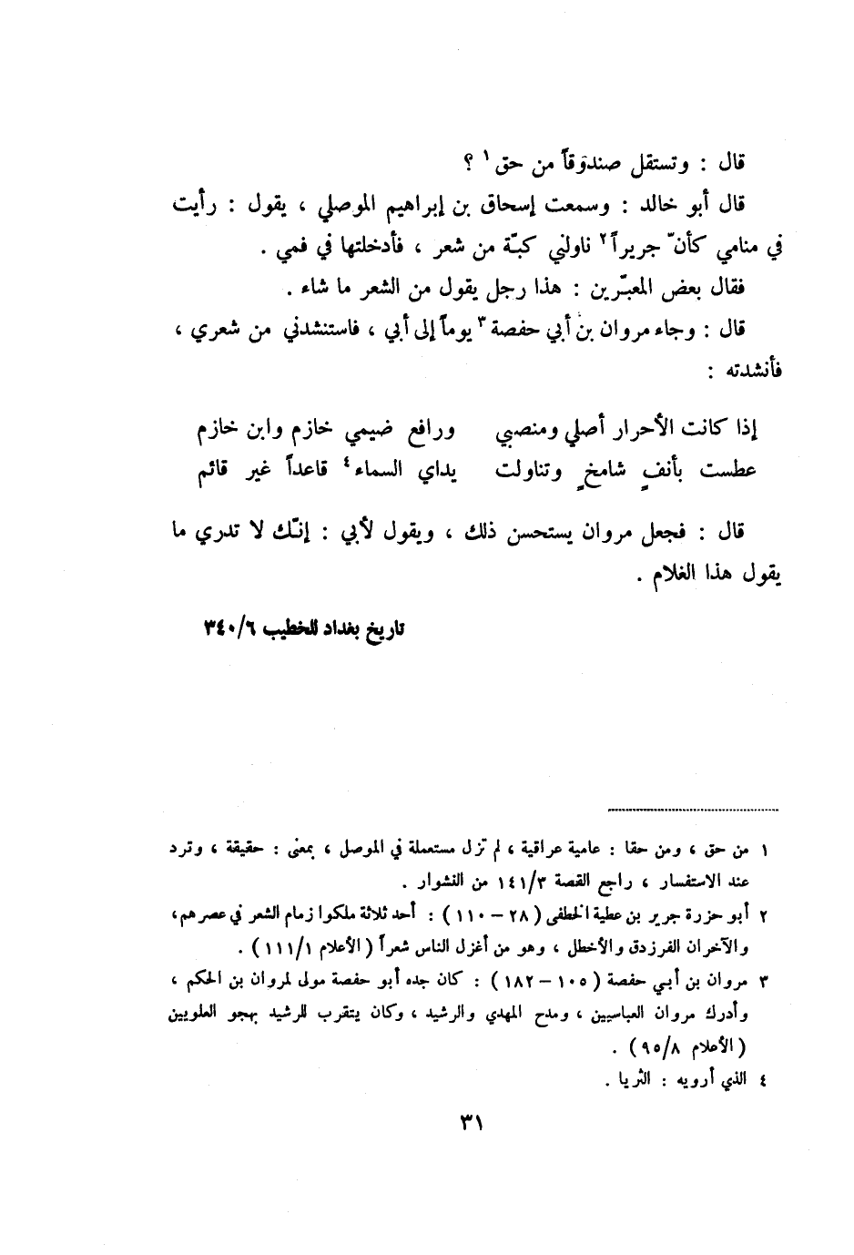 قال أبو خالد: وسمعت إسحاق بن إبراهيم الموصلي، يقول: رأيت في منامي كأنّ جريرا «2» ناولني كبّة من شعر، فأدخلتها في فمي.