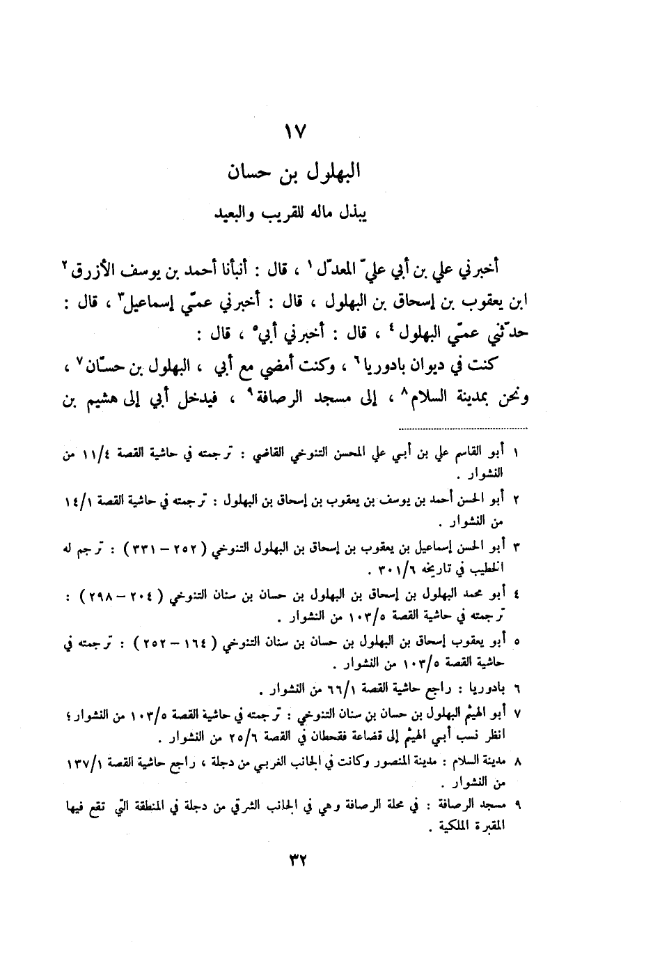 كنت في ديوان بادوريا «6» ، وكنت أمضي مع أبي، البهلول بن حسّان «7» ، ونحن بمدينة السلام «8» ، إلى مسجد الرصافة «9» ، فيدخل أبي إلى هشيم بن