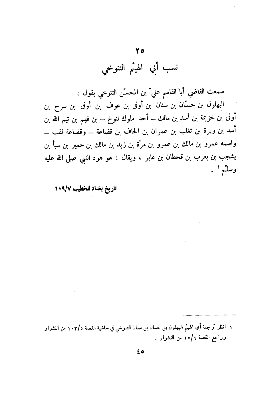 البهلول بن حسّان بن سنان بن أوفى بن عوف بن أوفى بن سرح بن أوفى بن خزيمة بن أسد بن مالك- أحد ملوك تنوخ- بن فهم بن تيم الله بن أسد بن وبرة بن تغلب بن عمران بن الحاف بن قضاعة- وقضاعة لقب- واسمه عمرو بن مالك بن عمرو بن مرّة بن زيد بن مالك بن حمير بن سبأ بن يشجب بن يعرب بن قحطان بن عابر، ويقال: هو هود النبي صلى الله عليه وسلّم «1» .