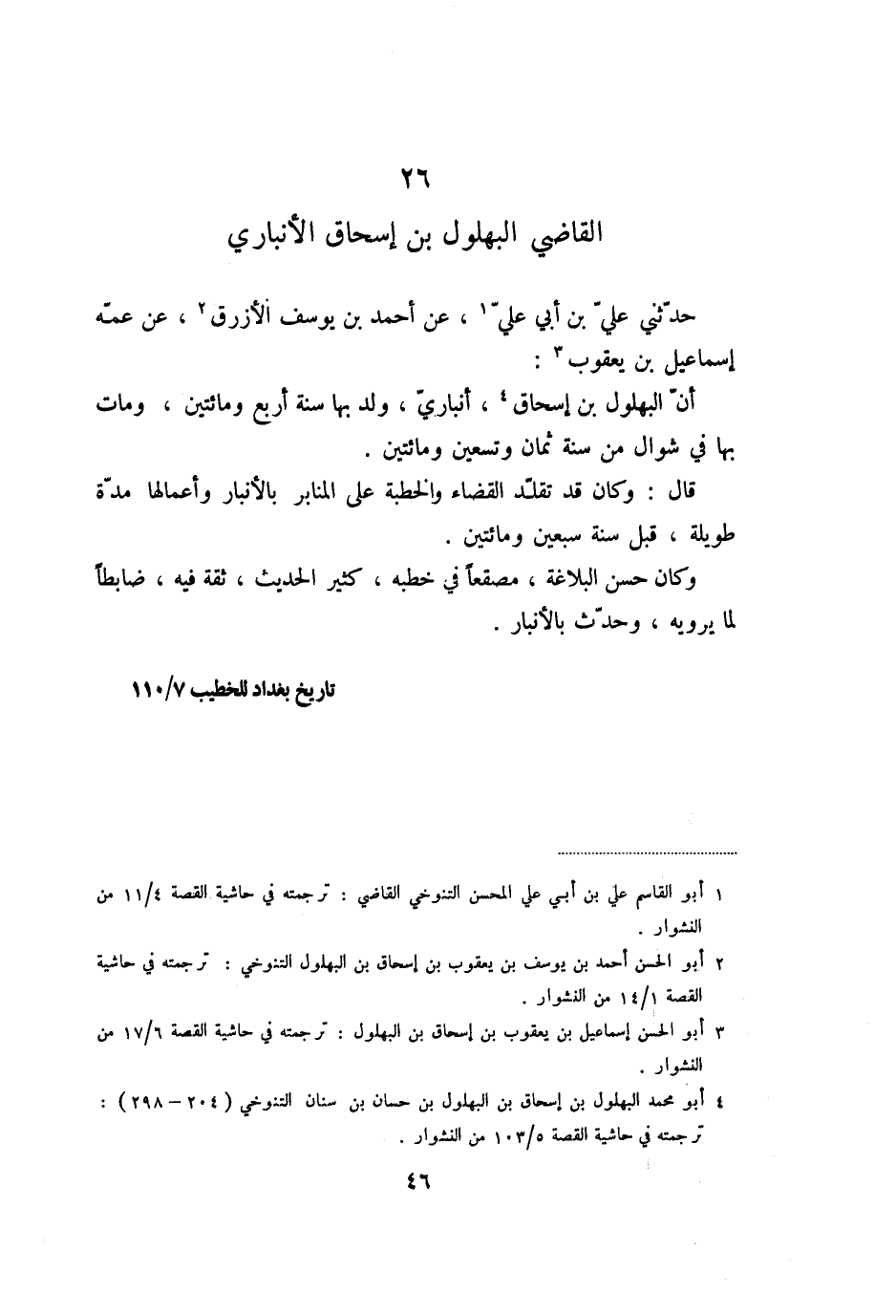 قال: وكان قد تقلّد القضاء والخطبة على المنابر بالأنبار وأعمالها مدّة طويلة، قبل سنة سبعين ومائتين.