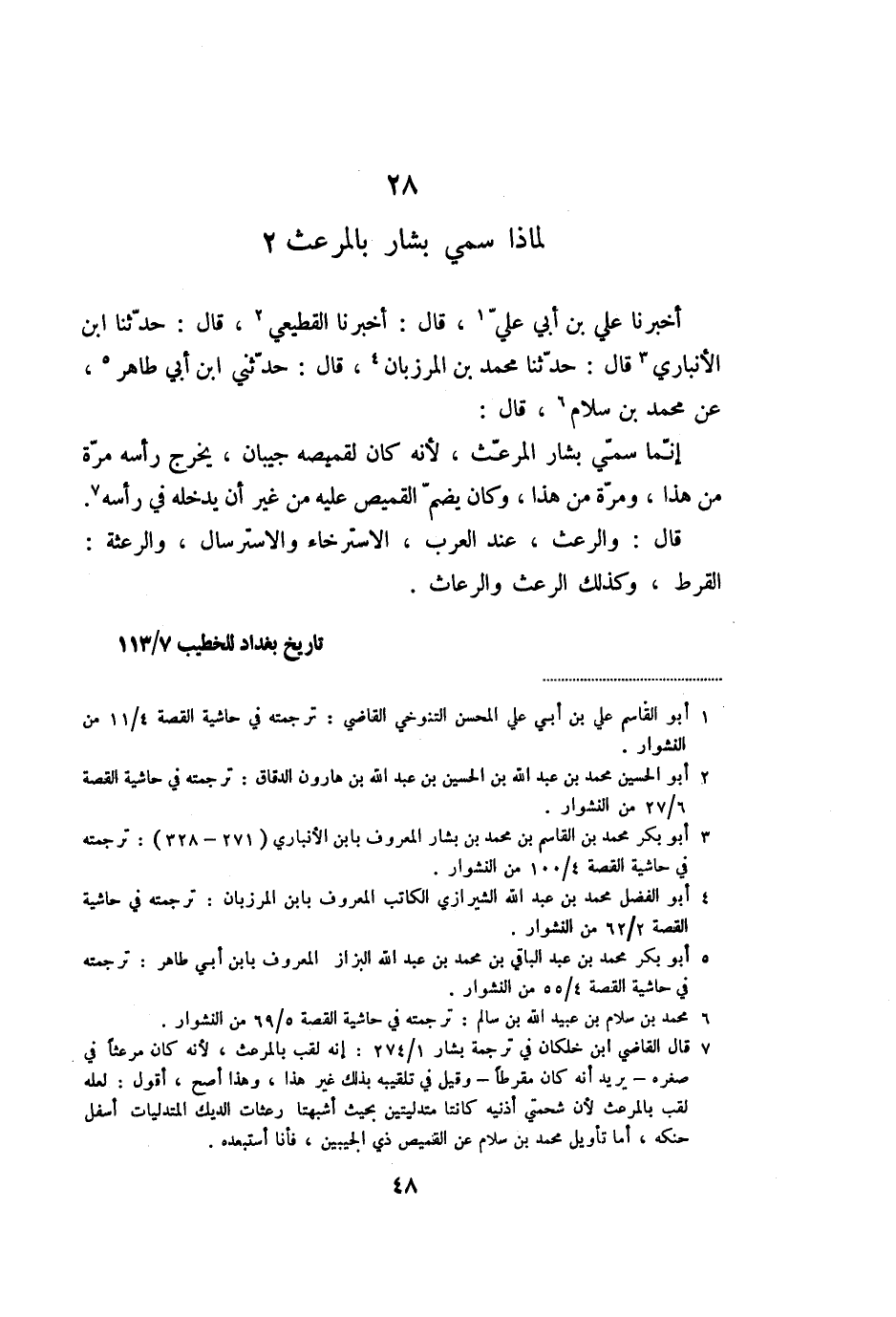 إنّما سمّي بشار المرعّث، لأنه كان لقميصه جيبان، يخرج رأسه مرّة من هذا، ومرّة من هذا، وكان يضمّ القميص عليه من غير أن يدخله في رأسه «7» .