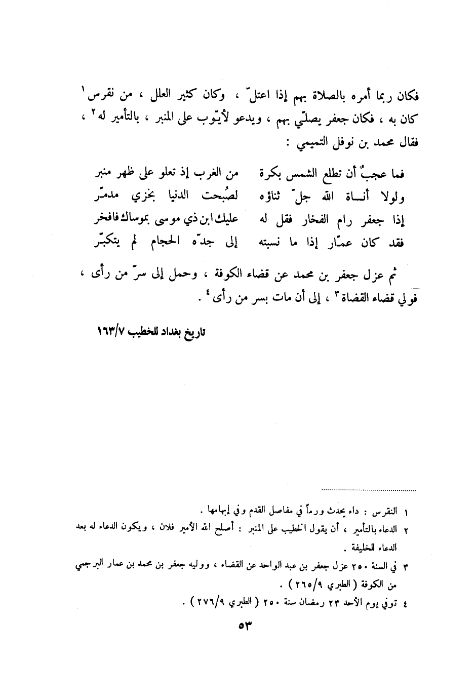 فكان ربما أمره بالصلاة بهم إذا اعتلّ، وكان كثير العلل، من نقرس «1» كان به، فكان جعفر يصلّي بهم، ويدعو لأيّوب على المنبر، بالتأمير له «2» ، فقال محمد بن نوفل التميمي: