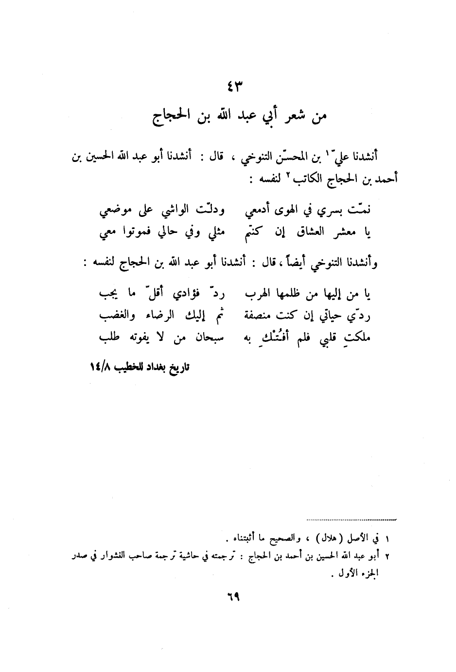 وأنشدنا التنوخي أيضا، قال: أنشدنا أبو عبد الله بن الحجاج لنفسه: