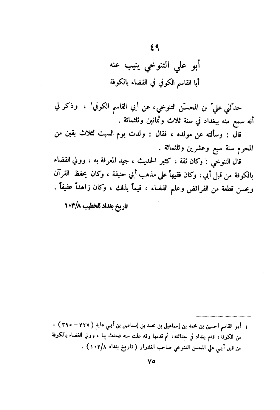 49 أبو علي التنوخي ينيب عنه أبا القاسم الكوفي في القضاء بالكوفة