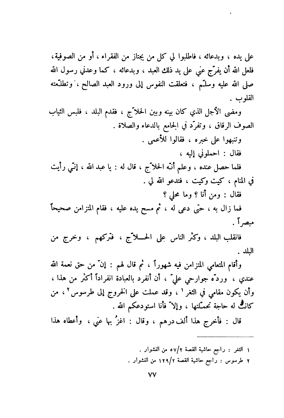 فقال: احملوني إليه، فلما حصل عنده، وعلم أنّه الحلّاج، قال له: يا عبد الله، إنّي رأيت في المنام، كيت وكيت، فتدعو الله لي.
