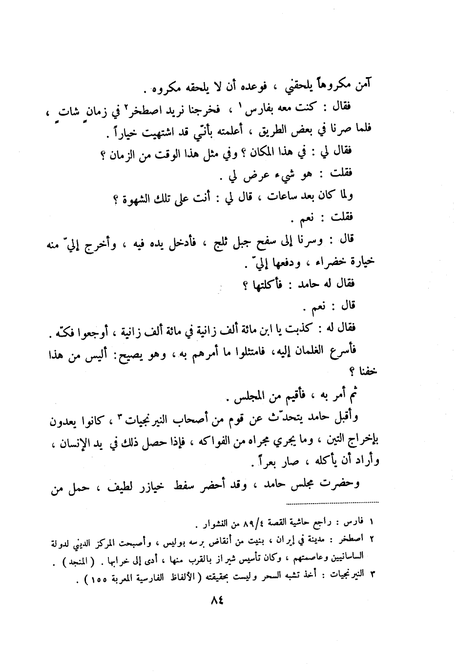 وأقبل حامد يتحدّث عن قوم من أصحاب النيرنجيات «3» ، كانوا يعدون بإخراج التين، وما يجري مجراه من الفواكه، فإذا حصل ذلك في يد الإنسان، وأراد أن يأكله، صار بعرا.