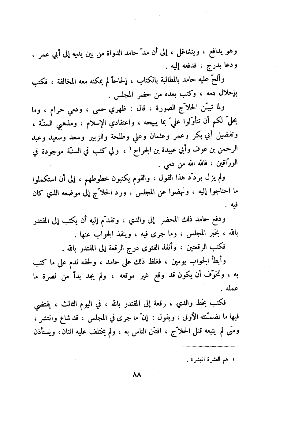 ولما تبيّن الحلّاج الصورة، قال: ظهري حمى، ودمي حرام، وما يحلّ لكم أن تتأوّلوا عليّ بما يبيحه، واعتقادي الإسلام، ومذهبي السنّة، وتفضيل أبي بكر وعمر وعثمان وعلي وطلحة والزبير وسعد وسعيد وعبد الرحمن بن عوف وأبي عبيدة بن الجراح «1» ، ولي كتب في السنّة موجودة في الورّاقين، فالله الله من دمي.
