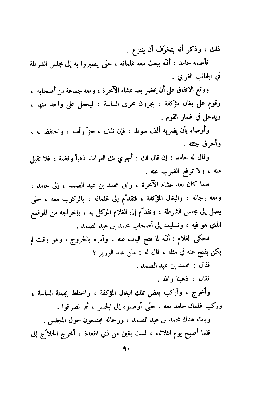 فلما كان بعد عشاء الآخرة، وافى محمد بن عبد الصمد، إلى حامد، ومعه رجاله، والبغال المؤكفة، فتقدّم إلى غلمانه، بالركوب معه، حتى يصل إلى مجلس الشرطة، وتقدّم إلى الغلام الموكل به، بإخراجه من الموضع الذي هو فيه، وتسليمه إلى أصحاب محمد بن عبد الصمد.