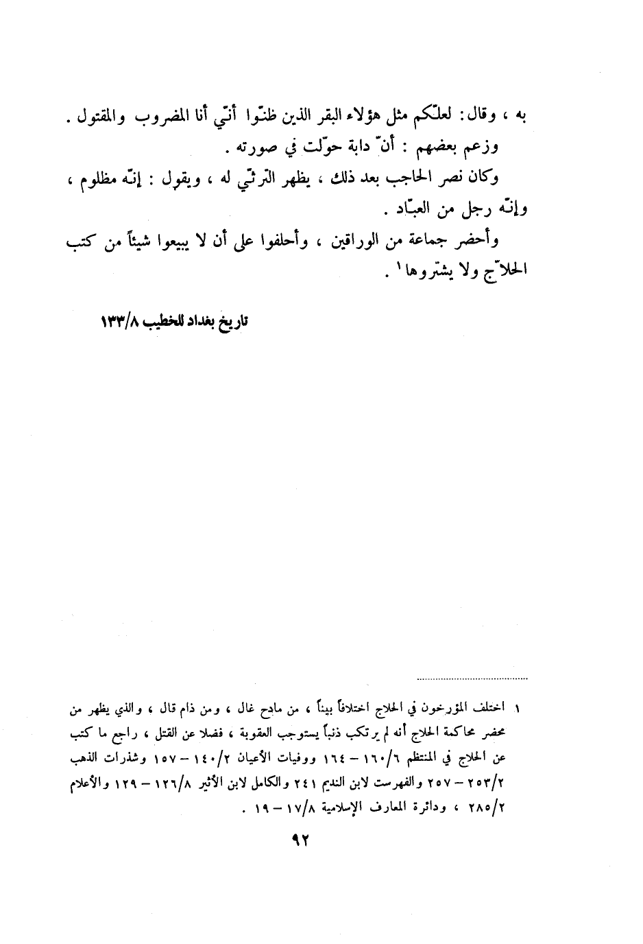 وأحضر جماعة من الوراقين، وأحلفوا على أن لا يبيعوا شيئا من كتب الحلّاج ولا يشتروها «1» .