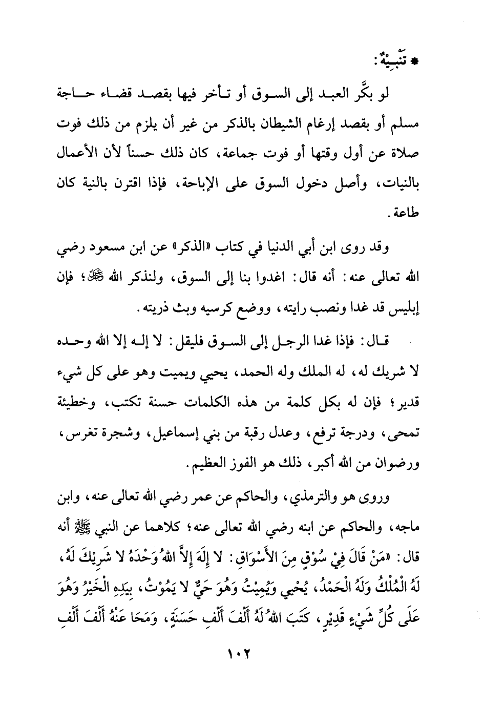 وروى هو والترمذي، والحاكم عن عمر رضي الله تعالى عنه، وابن ماجه، والحاكم عن ابنه رضي الله تعالى عنه؛ كلاهما عن النبي - صلى الله عليه وسلم - أنه قال: "مَنْ قَالَ فِيْ سُوْقٍ مِنَ الأَسْوَاقِ: لا إِلَهَ إِلاَّ اللهُ وَحْدَهُ لا شَرِيْكَ لَهُ، لَهُ الْمُلْكُ وَلَهُ الْحَمْدُ، يُحْيى ويُمِيْتُ وَهُوَ حَيٌّ لا يَمُوْتُ، بِيَدهِ الخَيْرُ وَهُوَ عَلَى كُلِّ شَيْءٍ قَدِيْر، كتَبَ اللهُ لَهُ أَلفَ أَلفِ حَسَنَةٍ، وَمَحَا عَنْهُ أَلْفَ ألْفِ
