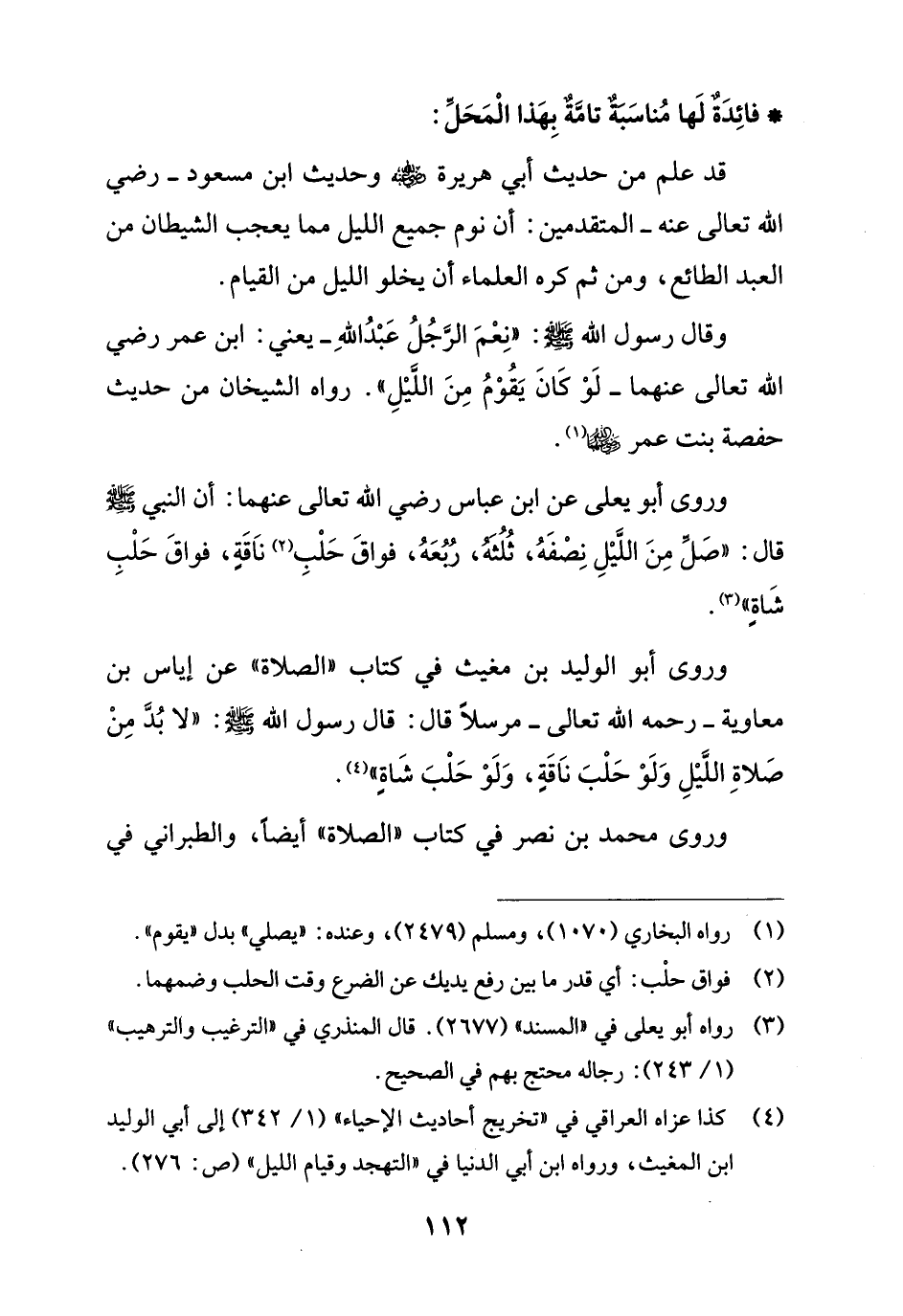 وقال رسول الله - صلى الله عليه وسلم -: "نِعْمَ الرَّجُلُ عَبْدُ اللهِ - يعني: ابن عمر رضي الله تعالى عنهما - لَوْ كَانَ يَقُوْمُ مِنَ اللَّيْلِ". رواه الشيخان من حديث حفصة بنت عمر - رضي الله عنهما - (¬1).