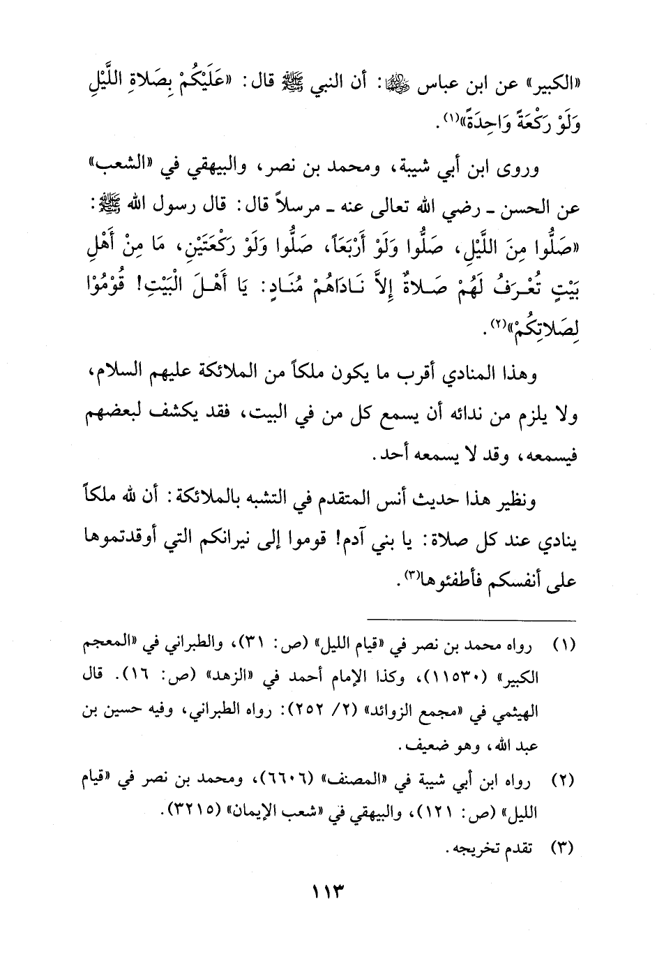 "الكبير" عن ابن عباس - رضي الله عنهما -: أن النبي - صلى الله عليه وسلم - قال: "عَلَيْكُمْ بِصَلاةِ اللَّيْلِ وَلَوْ رَكْعَةً وَاحِدَةً" (¬1).