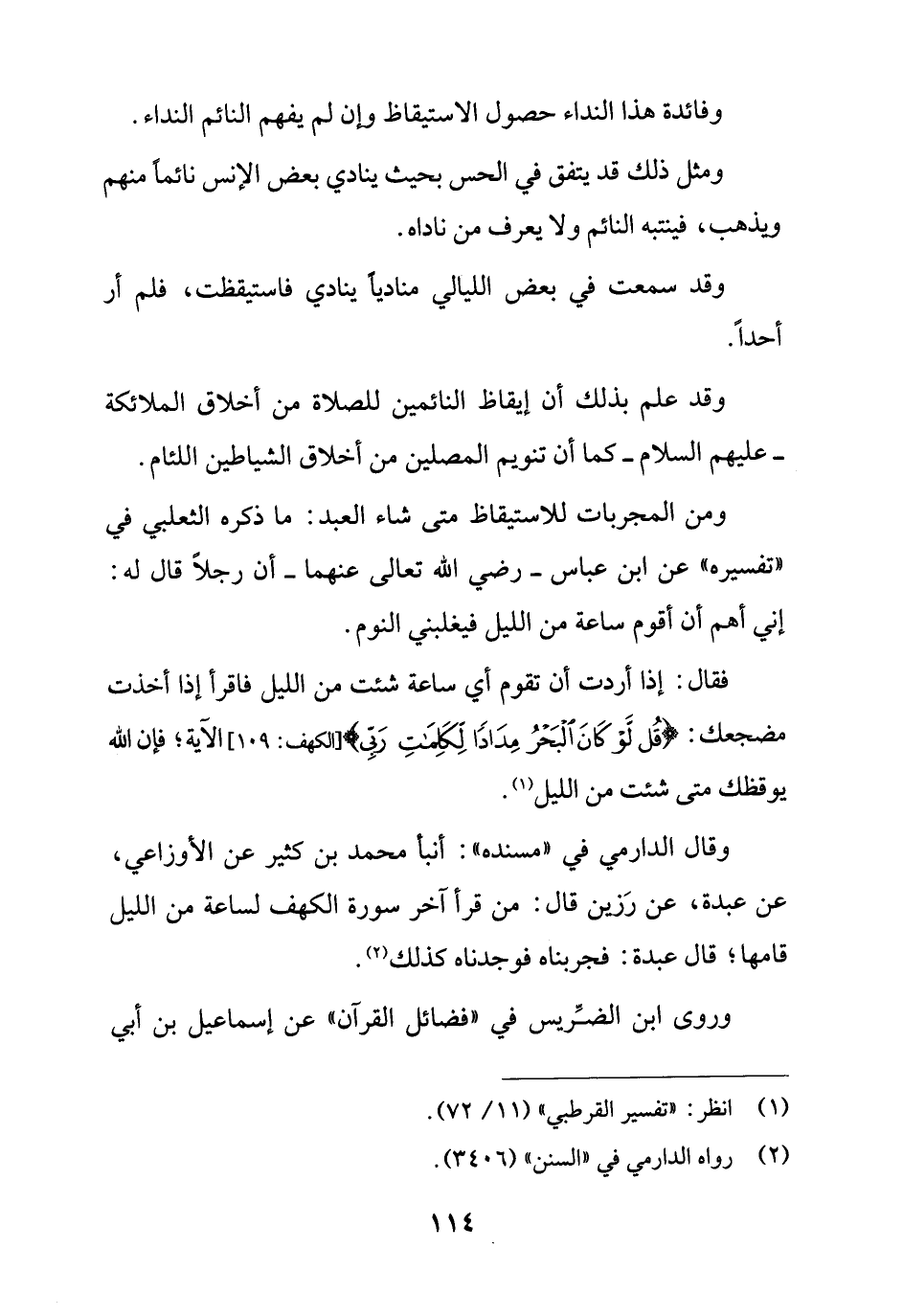 ومن المجربات للاستيقاظ متى شاء العبد: ما ذكره الثعلبي في "تفسيره" عن ابن عباس - رضي الله تعالى عنهما - أن رجلًا قال له: إني أهم أن أقوم ساعة من الليل فيغلبني النوم.