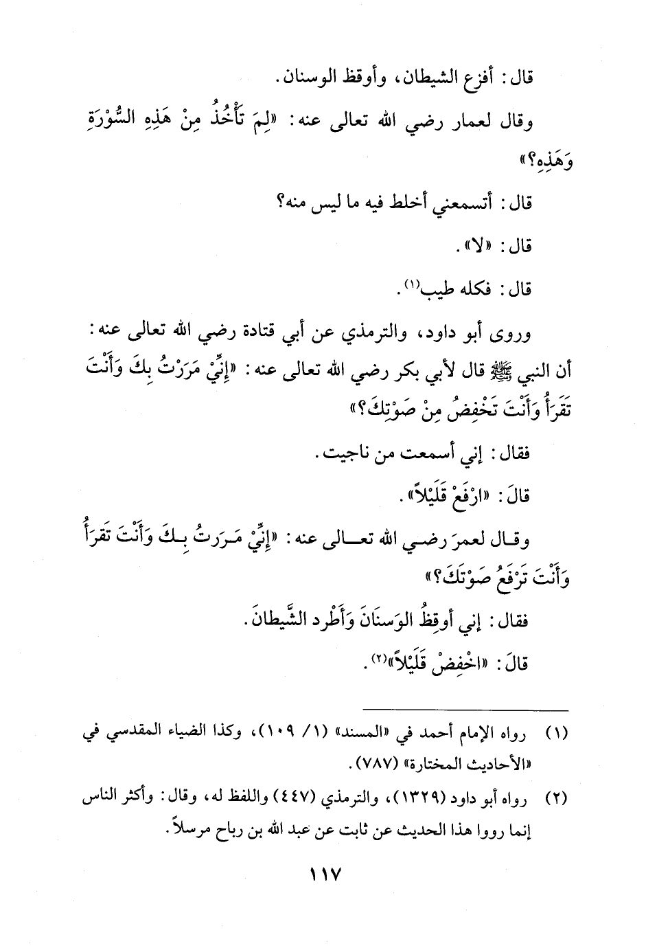 وروى أبو داود، والترمذي عن أبي قتادة رضي الله تعالى عنه: أن النبي - صلى الله عليه وسلم - قال لأبي بكر رضي الله تعالى عنه: "إنيْ مَرَرْتُ بِكَ وَأَنْتَ تَقَرَأُ وَأَنْتَ تَخْفِضُ مِنْ صَوْتك؟ "