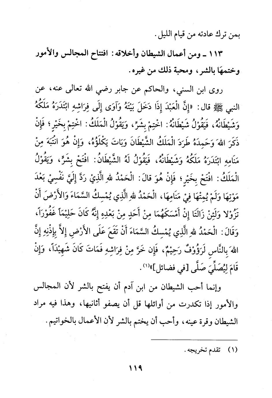 113 - ومن أعمال الشيطان وأخلاقه: افتتاح المجالس والأمور وختمهَا بالشر، ومحبة ذلك من غيره.