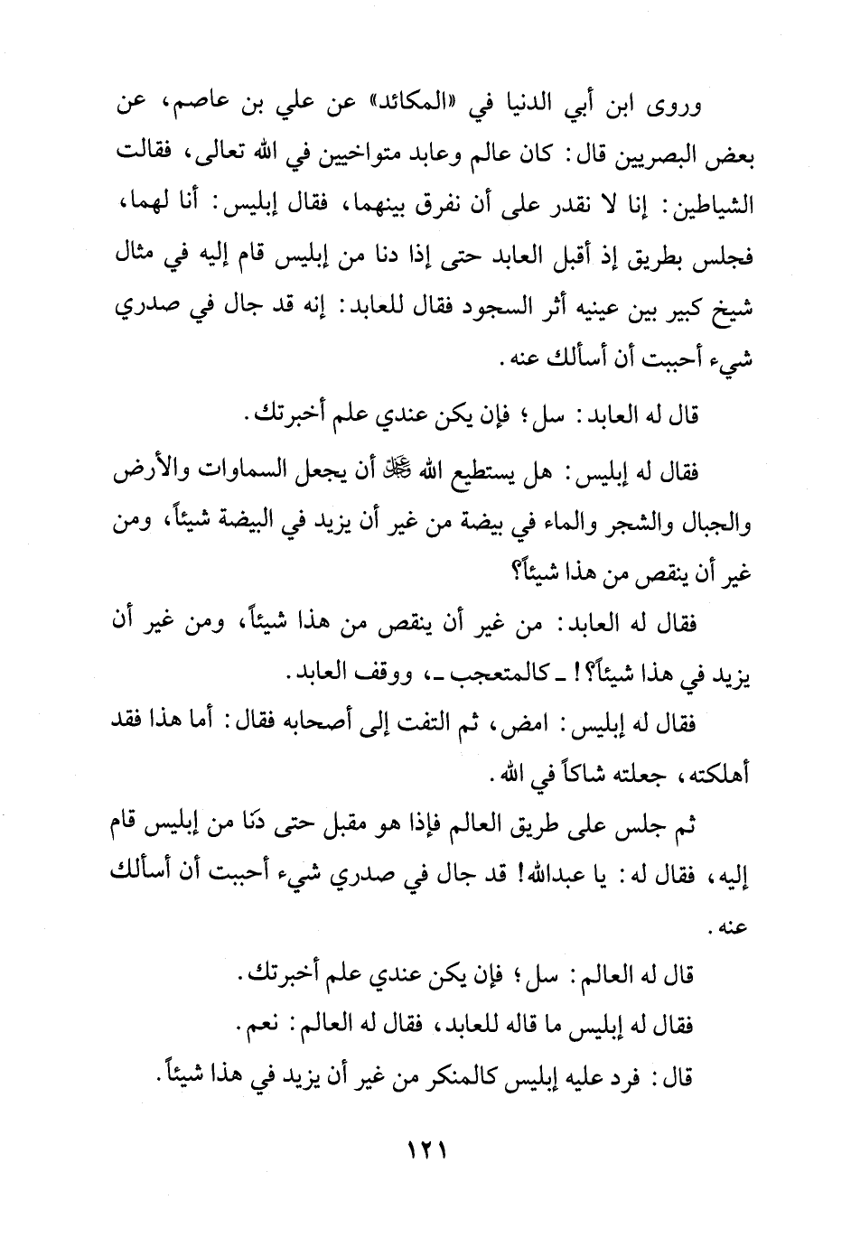 ثم جلس على طريق العالم فإذا هو مقبل حتى دَنا من إبليس قام إليه، فقال له: يا عبد الله! قد جمال في صدري شيء أحببت أن أسألك عنه.