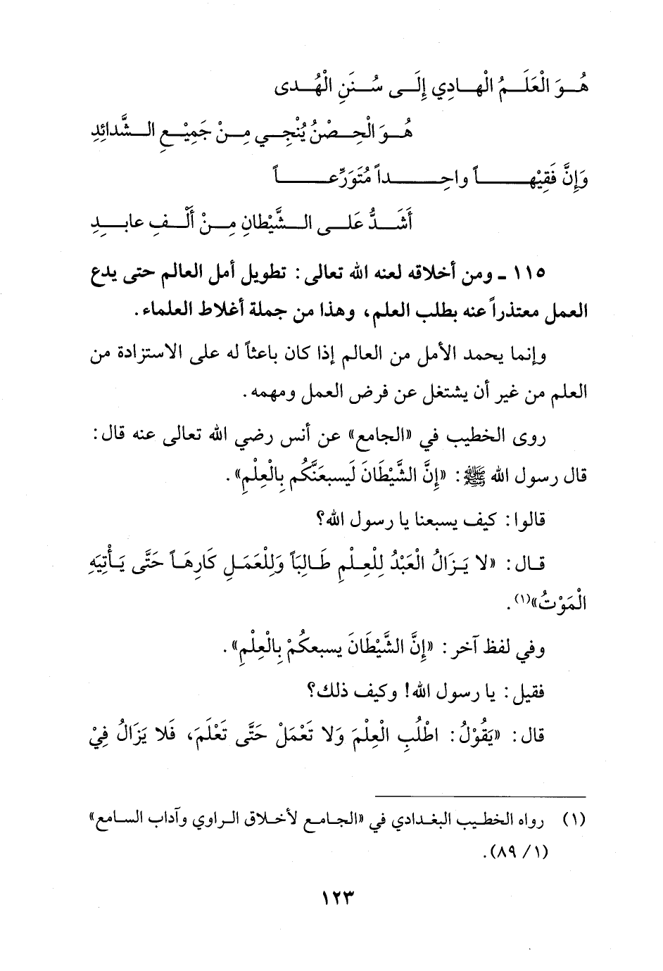 روى الخطيب في "الجامع" عن أنس رضي الله تعالى عنه قال: قال رسول الله - صلى الله عليه وسلم -: "إِنَّ الشَّيْطَانَ لَيسبعَنَّكُم بِالْعِلْمِ".