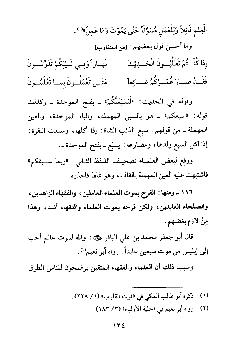 116 - ومنها: الفرح بموت العلماء العاملين، والفقهاء الزاهدين، والصلحاء العابدين، ولكن فرحه بموت العلماء والفقهاء أشد، وهذا مِنْ لازم بغضهم.