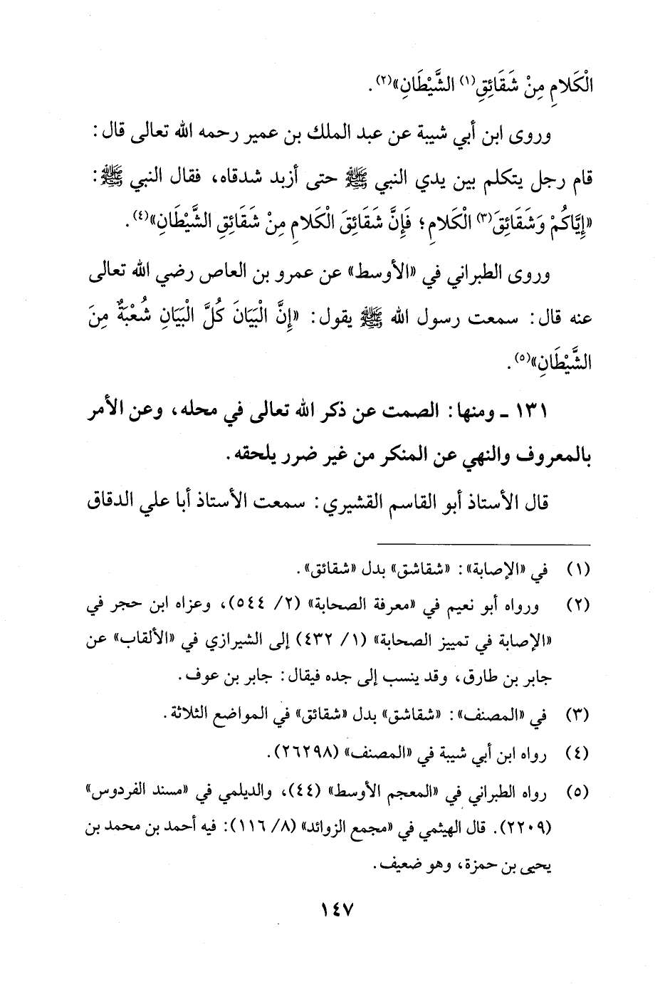 وروى ابن أبي شيبة عن عبد الملك بن عمير رحمه الله تعالى قال: قام رجل يتكلم بين يدي النبي - صلى الله عليه وسلم - حتى أزبد شدقاه، فقال النبي - صلى الله عليه وسلم -: "إِيَّاكُمْ وَشَقَائِقَ (¬3) الْكَلامِ؛ فَإِنَّ شَقَائِقَ الْكَلامِ مِنْ شَقَائِقِ الشَّيْطَانِ" (¬4).