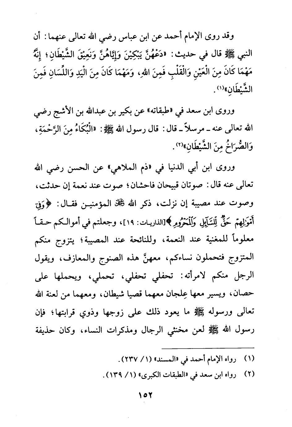 وقد روى الإمام أحمد عن ابن عباس رضي الله تعالى عنهما: أن النبي - رضي الله عنه - قال في حديث: "دَعْهُنَّ يَبْكِيْنَ وَإِيَّاهُنَّ وَنَعِيْقَ الشَّيْطَانِ؛ إِنَّةُ مَهْمَا كَانَ مِنَ الْعَيْنِ وَالْقَلْبِ فَمِنَ اللهِ، وَمَهْمَا كَانَ مِنَ الْيَدِ وَاللِّسَانِ فَمِنَ الشَّيْطَانِ" (¬1).