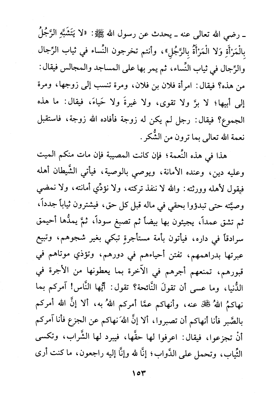 - رضي الله تعالى عنه - يحدث عن رسول الله - صلى الله عليه وسلم -: "لا يَتَشَبَّهِ الرَّجُلُ بِالْمَرْأَةِ وَلا الْمَرْأةُ الرَّجُلِ"، وأنتم تخرجون النِّساء في ثياب الرِّجال والرِّجال في ثياب النِّساء، ثم يمر بها على المساجد والمجالس فيقال: من هذه؛ فيقال: امرأة فلان بن فلان، ومرة تنسب إلى زوجها، ومرة إلى أبيها؛ لا برَّ ولا تقوى، ولا غيرةَ ولا حَياءَ، فيقال: ما هذه الجموع؟ فيقال: رجل لم يكن له زوجة فأفاده الله زوجة، فاستقبل نعمة الله تعالى بما ترون من الشّكر.